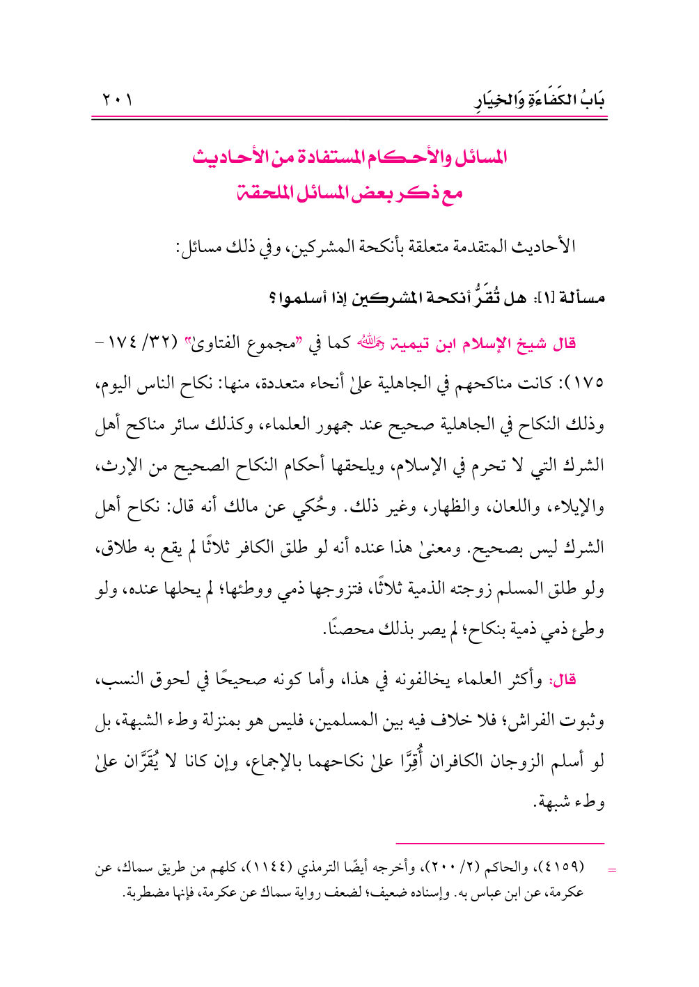 الأحاديث المتقدمة متعلقة بأنكحة المشركين، وفي ذلك مسائل:
