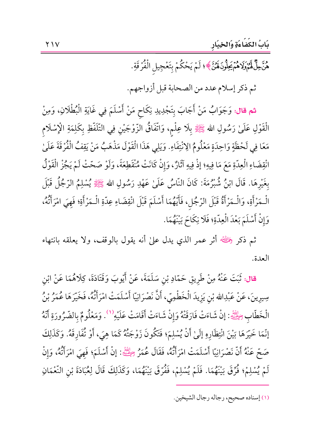 قال: ثَبَتَ عَنْهُ مِنْ طَرِيقِ حَمّادِ بْنِ سَلَمَةَ، عَنْ أَيّوبَ وَقَتَادَةَ، كِلَاهُمَا عَنْ ابْنِ سِيرِينَ، عَنْ عَبْدِالله بْنِ يَزِيدَ الْخَطْمِيّ، أَنَّ نَصْرَانِيّا أَسْلَمَتْ امْرَأَتُهُ، فَخَيّرَهَا عُمَرُ بْنُ الْخَطّابِ -رضي الله عنه-: إنْ شَاءَتْ فَارَقَتْهُ وَإِنْ شَاءَتْ أَقَامَتْ عَلَيْهِ (¬١). وَمَعْلُومٌ بِالضّرُورَةِ أَنّهُ إنّمَا خَيّرَهَا بَيْنَ انْتِظَارِهِ إلَى أَنْ يُسْلِمَ؛ فَتَكُونَ زَوْجَتُهُ كَمَا هِيَ، أَوْ تُفَارِقَهُ. وَكَذَلِكَ صَحّ عَنْهُ أَنّ نَصْرَانِيّا أَسْلَمَتْ امْرَأَتُهُ، فَقَالَ عُمَرُ -رضي الله عنه-: إنْ أَسْلَمَ؛ فَهِيَ امْرَأَتُهُ، وَإِنْ لَمْ يُسْلِمْ؛ فُرِّقَ بَيْنَهُمَا. فَلَمْ يُسْلِمْ، فَفُرّقَ بَيْنَهُمَا، وَكَذَلِكَ قَالَ لِعُبَادَةَ بْنِ النّعْمَانِ