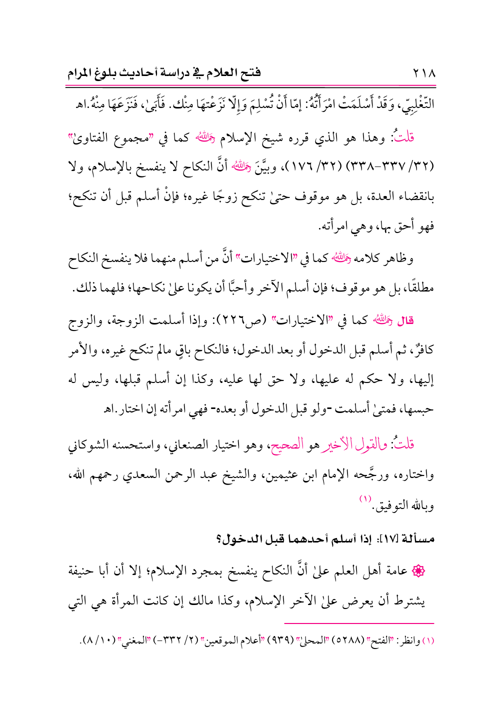 قلتُ: وهذا هو الذي قرره شيخ الإسلام -رحمه الله- كما في «مجموع الفتاوى» (٣٢/ ٣٣٧ - ٣٣٨) (٣٢/ ١٧٦)، وبيَّنَ -رحمه الله- أنَّ النكاح لا ينفسخ بالإسلام، ولا بانقضاء العدة، بل هو موقوف حتى تنكح زوجًا غيره؛ فإنْ أسلم قبل أن تنكح؛ فهو أحق بها، وهي امرأته.