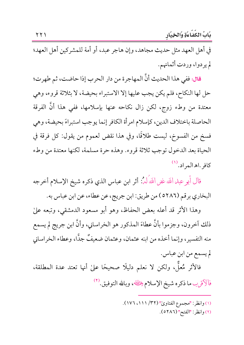 قال: ففي هذا الحديث أنَّ المهاجرة من دار الحرب إذا حاضت، ثم طهرت؛ حل لها النكاح، فلم يكن يجب عليها إلا الاستبراء بحيضة، لا بثلاثة قروء، وهي معتدة من وطء زوج، لكن زال نكاحه عنها بإسلامها، ففي هذا أنَّ الفرقة الحاصلة باختلاف الدين، كإسلام امرأة الكافر إنما يوجب استبراءً بحيضة، وهي فسخ من الفسوخ، ليست طلاقًا، وفي هذا نقض لعموم من يقول: كل فرقة في الحياة بعد الدخول توجب ثلاثة قروء. وهذه حرة مسلمة، لكنها معتدة من وطء كافر. اهـ المراد. (¬١)