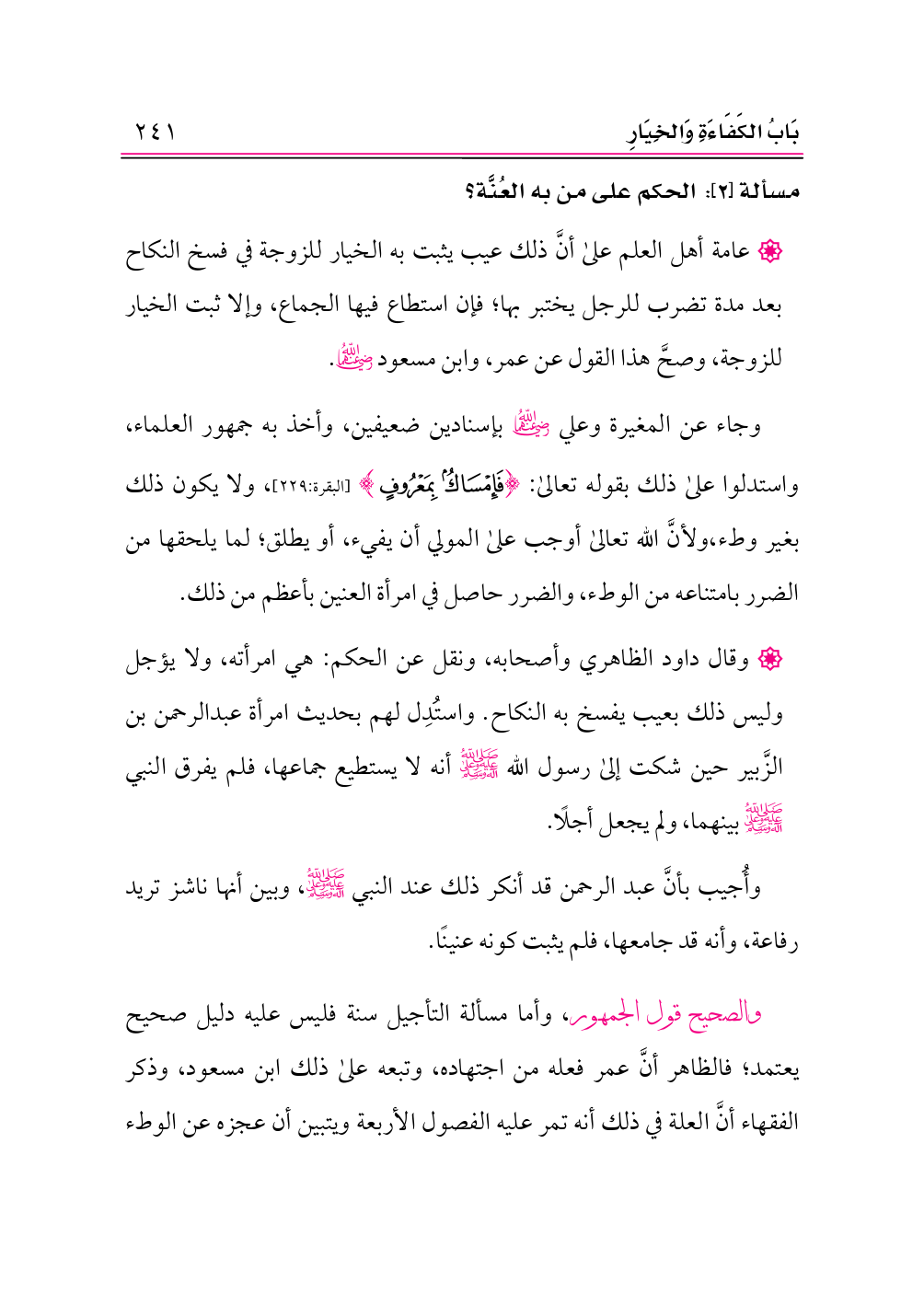 والصحيح قول الجمهور، وأما مسألة التأجيل سنة فليس عليه دليل صحيح يعتمد؛ فالظاهر أنَّ عمر فعله من اجتهاده، وتبعه على ذلك ابن مسعود، وذكر الفقهاء أنَّ العلة في ذلك أنه تمر عليه الفصول الأربعة ويتبين أن عجزه عن الوطء