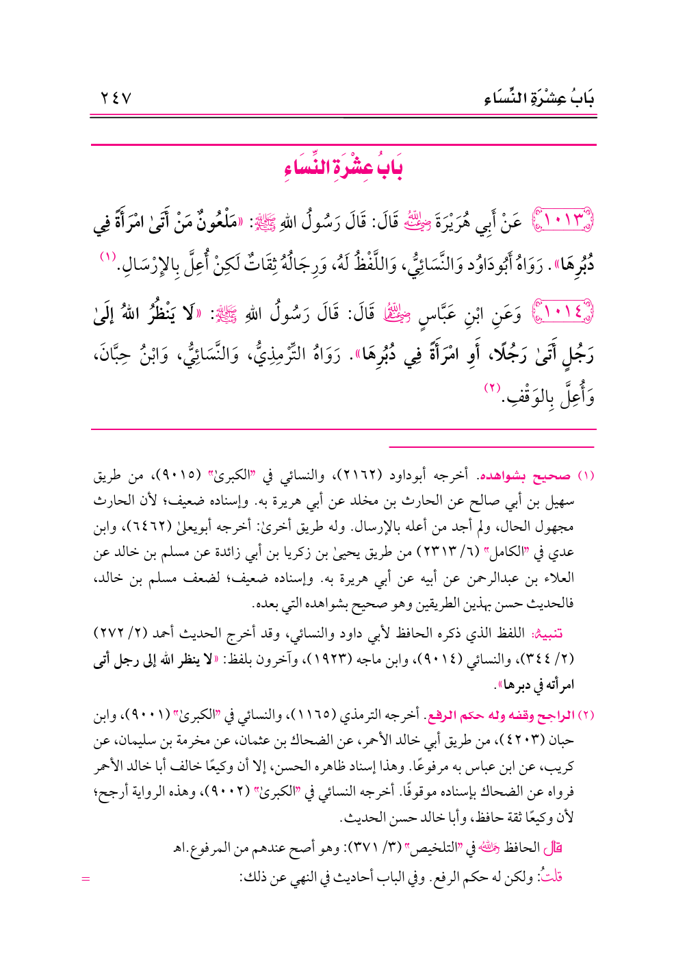 ١٠١٣ - عَنْ أَبِي هُرَيْرَةَ -رضي الله عنه- قَالَ: قَالَ رَسُولُ اللهِ - صلى الله عليه وسلم -: «مَلْعُونٌ مَنْ أَتَى امْرَأَةً فِي دُبُرِهَا». رَوَاهُ أَبُودَاوُد وَالنَّسَائِيُّ، وَاللَّفْظُ لَهُ، وَرِجَالُهُ ثِقَاتٌ لَكِنْ أُعِلَّ بِالإِرْسَالِ. (¬١)