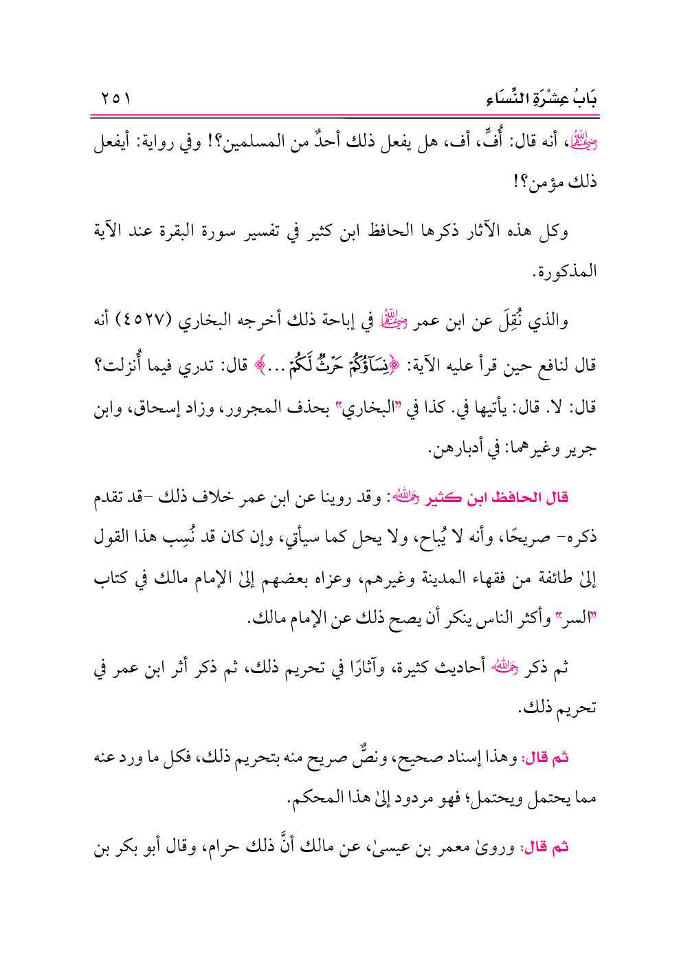 ثم ذكر -رحمه الله- أحاديث كثيرة، وآثارًا في تحريم ذلك، ثم ذكر أثر ابن عمر في تحريم ذلك.