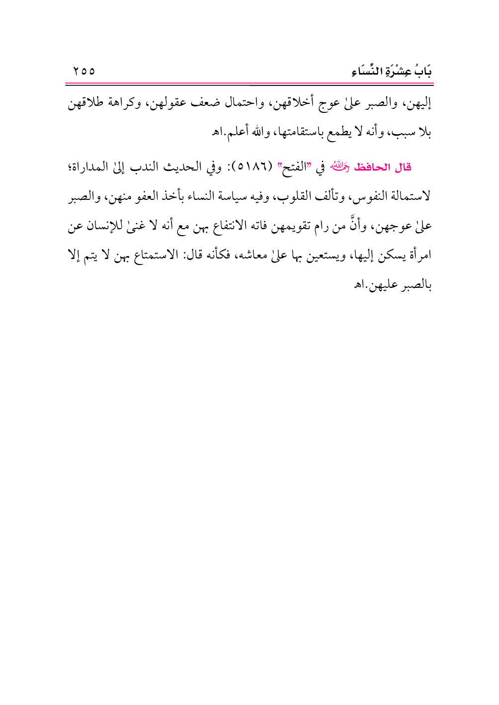قال الحافظ -رحمه الله- في «الفتح» (٥١٨٦): وفي الحديث الندب إلى المداراة؛ لاستمالة النفوس، وتألف القلوب، وفيه سياسة النساء بأخذ العفو منهن، والصبر على عوجهن، وأنَّ من رام تقويمهن فاته الانتفاع بهن مع أنه لا غنى للإنسان عن امرأة يسكن إليها، ويستعين بها على معاشه، فكأنه قال: الاستمتاع بهن لا يتم إلا بالصبر عليهن. اهـ