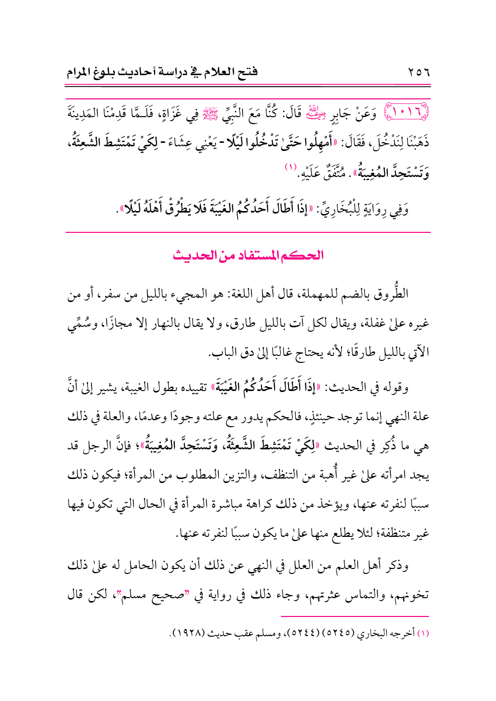 ١٠١٦ - وَعَنْ جَابِرٍ -رضي الله عنه- قَالَ: كُنَّا مَعَ النَّبِيِّ - صلى الله عليه وسلم - فِي غَزَاةٍ، فَلَمَّا قَدِمْنَا المَدِينَةَ ذَهَبْنَا لِنَدْخُلَ، فَقَالَ: «أَمْهِلُوا حَتَّى تَدْخُلُوا لَيْلًا يَعْنِي عِشَاءً لِكَيْ تَمْتَشِطَ الشَّعِثَةُ، وَتَسْتَحِدَّ المُغِيبَةُ». مُتَّفَقٌ عَلَيْهِ. (¬١)