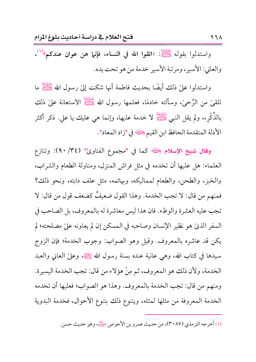 وقال شيخ الإسلام -رحمه الله- كما في «مجموع الفتاوى» (٣٤/ ٩٠): وتنازع العلماء: هل عليها أن تخدمه في مثل فراش المنزل، ومناولة الطعام والشراب، والخبز، والطحن، والطعام لمماليكه، وبهائمه، مثل علف دابته، ونحو ذلك؟ فمنهم من قال: لا تجب الخدمة. وهذا القول ضعيفٌ كضعف قول من قال: لا تجب عليه العشرة والوطء. فان هذا ليس معاشرة له بالمعروف، بل الصاحب في السفر الذى هو نظير الإنسان وصاحبه في المسكن إن لم يعاونه على مصلحته؛ لم يكن قد عاشره بالمعروف. وقيل وهو الصواب: وجوب الخدمة؛ فإن الزوج سيدها في كتاب الله، وهي عانية عنده بسنة رسول الله - صلى الله عليه وسلم -، وعلى العاني والعبد الخدمة، ولأن ذلك هو المعروف، ثم مِنْ هؤلاء من قال: تجب الخدمة اليسيرة. ومنهم من قال: تجب الخدمة بالمعروف. وهذا هو الصواب؛ فعليها أن تخدمه الخدمة المعروفة من مثلها لمثله، ويتنوع ذلك بتنوع الأحوال، فخدمة البدوية
