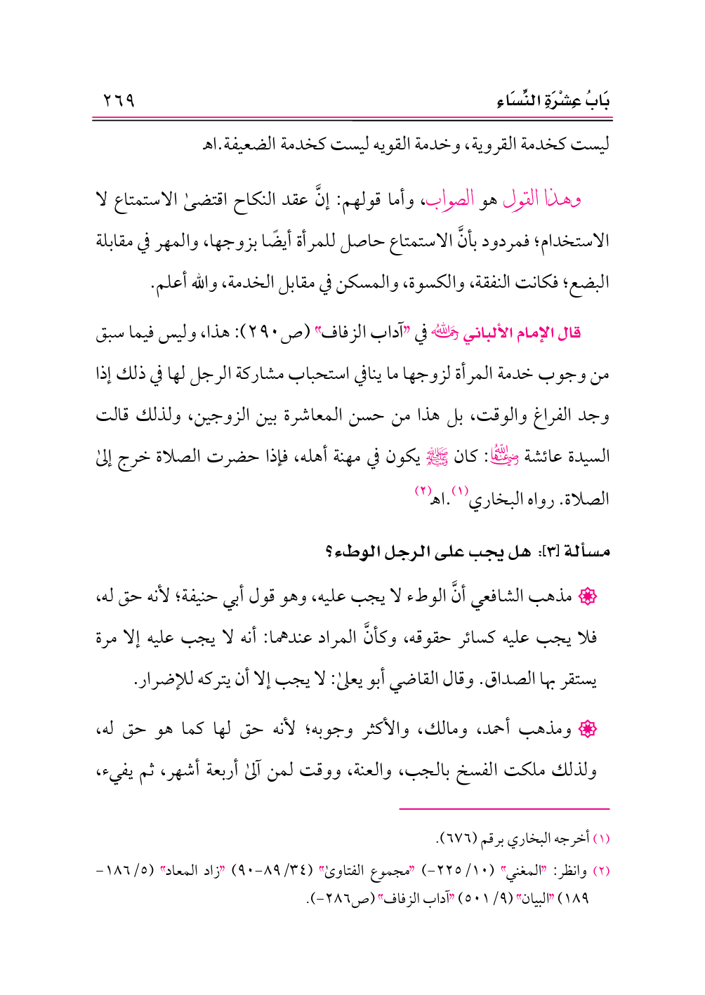 قال الإمام الألباني -رحمه الله- في «آداب الزفاف» (ص ٢٩٠): هذا، وليس فيما سبق من وجوب خدمة المرأة لزوجها ما ينافي استحباب مشاركة الرجل لها في ذلك إذا وجد الفراغ والوقت، بل هذا من حسن المعاشرة بين الزوجين، ولذلك قالت السيدة عائشة -رضي الله عنها-: كان - صلى الله عليه وسلم - يكون في مهنة أهله، فإذا حضرت الصلاة خرج إلى الصلاة. رواه البخاري (¬١). اهـ (¬٢)