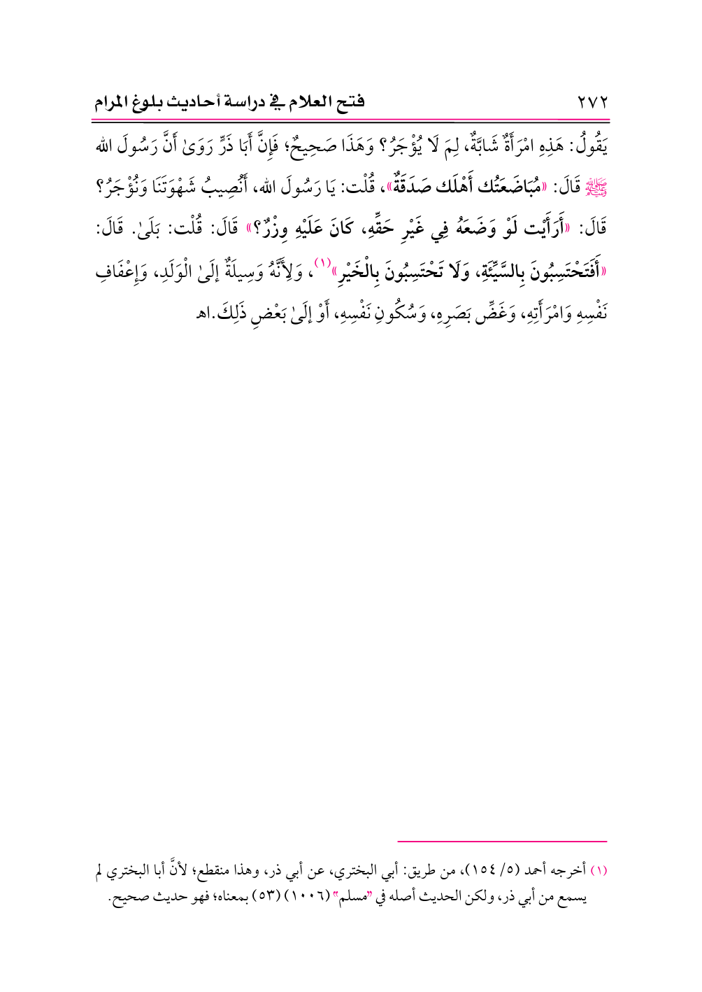 (¬١) أخرجه أحمد (٥/ ١٥٤)، من طريق: أبي البختري، عن أبي ذر، وهذا منقطع؛ لأنَّ أبا البختري لم يسمع من أبي ذر، ولكن الحديث أصله في «مسلم» (١٠٠٦) (٥٣) بمعناه؛ فهو حديث صحيح.