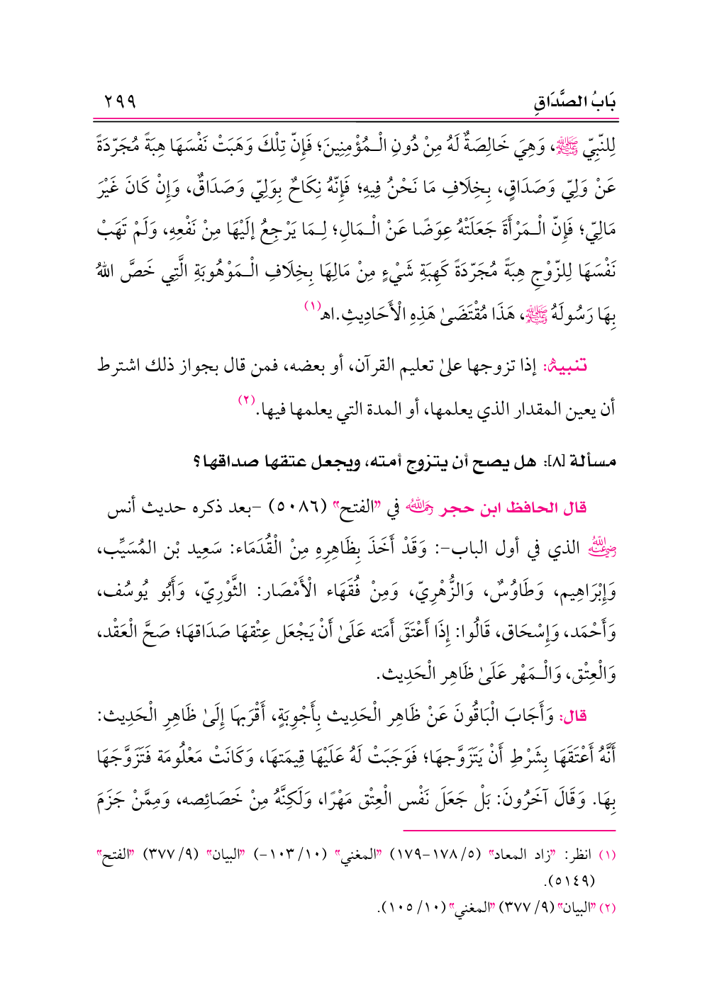 قال: وَأَجَابَ الْبَاقُونَ عَنْ ظَاهِر الْحَدِيث بِأَجْوِبَةٍ، أَقْرَبهَا إِلَى ظَاهِرِ الْحَدِيث: أَنَّهُ أَعْتَقَهَا بِشَرْطِ أَنْ يَتَزَوَّجهَا؛ فَوَجَبَتْ لَهُ عَلَيْهَا قِيمَتهَا، وَكَانَتْ مَعْلُومَة فَتَزَوَّجَهَا بِهَا. وَقَالَ آخَرُونَ: بَلْ جَعَلَ نَفْس الْعِتْق مَهْرًا، وَلَكِنَّهُ مِنْ خَصَائِصه، وَمِمَّنْ جَزَمَ