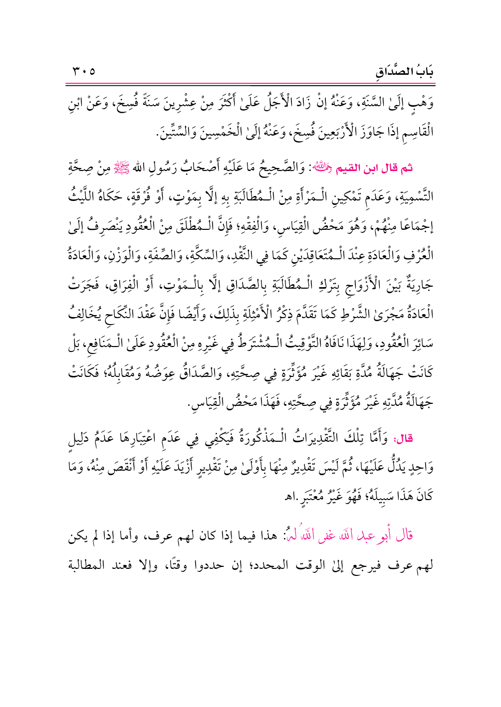 ثم قال ابن القيم -رحمه الله-: وَالصَّحِيحُ مَا عَلَيْهِ أَصْحَابُ رَسُولِ الله - صلى الله عليه وسلم - مِنْ صِحَّةِ التَّسْمِيَةِ، وَعَدَمِ تَمْكِينِ الْمَرْأَةِ مِنْ الْمُطَالَبَةِ بِهِ إلَّا بِمَوْتٍ، أَوْ فُرْقَةٍ، حَكَاهُ اللَّيْثُ إجْمَاعًا مِنْهُمْ، وَهُوَ مَحْضُ الْقِيَاسِ، وَالْفِقْهِ؛ فَإِنَّ الْمُطْلَقَ مِنْ الْعُقُودِ يَنْصَرِفُ إلَى الْعُرْفِ وَالْعَادَةِ عِنْدَ الْمُتَعَاقِدَيْنِ كَمَا فِي النَّقْدِ، وَالسِّكَّةِ، وَالصِّفَةِ، وَالْوَزْنِ، وَالْعَادَةُ جَارِيَةٌ بَيْنَ الْأَزْوَاجِ بِتَرْكِ الْمُطَالَبَةِ بِالصَّدَاقِ إلَّا بِالْمَوْتِ، أَوْ الْفِرَاقِ، فَجَرَتْ الْعَادَةُ مَجْرَى الشَّرْطِ كَمَا تَقَدَّمَ ذِكْرُ الْأَمْثِلَةِ بِذَلِكَ، وَأَيْضًا فَإِنَّ عَقْدَ النِّكَاحِ يُخَالِفُ سَائِرَ الْعُقُودِ، وَلِهَذَا نَافَاهُ التَّوْقِيتُ الْمُشْتَرَطُ فِي غَيْرِهِ مِنْ الْعُقُودِ عَلَى الْمَنَافِعِ، بَلْ كَانَتْ جَهَالَةُ مُدَّةِ بَقَائِهِ غَيْرَ مُؤَثِّرَةٍ فِي صِحَّتِهِ، وَالصَّدَاقُ عِوَضُهُ وَمُقَابِلُهُ؛ فَكَانَتْ جَهَالَةُ مُدَّتِهِ غَيْرَ مُؤَثِّرَةٍ فِي صِحَّتِهِ، فَهَذَا مَحْضُ الْقِيَاسِ.