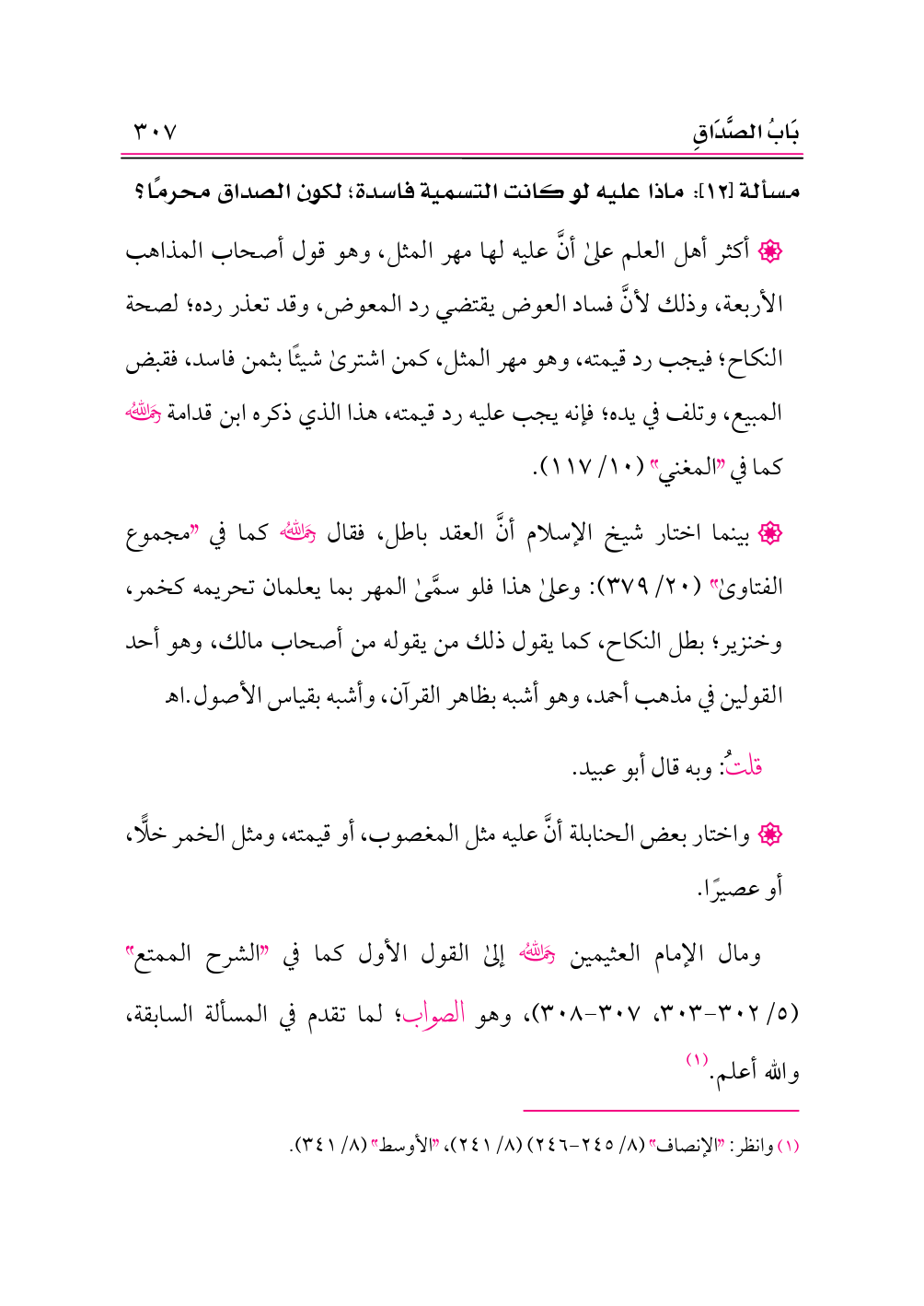 • بينما اختار شيخ الإسلام أنَّ العقد باطل، فقال -رحمه الله- كما في «مجموع الفتاوى» (٢٠/ ٣٧٩): وعلى هذا فلو سمَّى المهر بما يعلمان تحريمه كخمر، وخنزير؛ بطل النكاح، كما يقول ذلك من يقوله من أصحاب مالك، وهو أحد القولين في مذهب أحمد، وهو أشبه بظاهر القرآن، وأشبه بقياس الأصول. اهـ