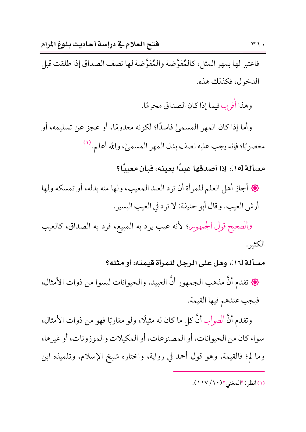 والصحيح قول الجمهور؛ لأنه عيب يرد به المبيع، فرد به الصداق، كالعيب الكثير.