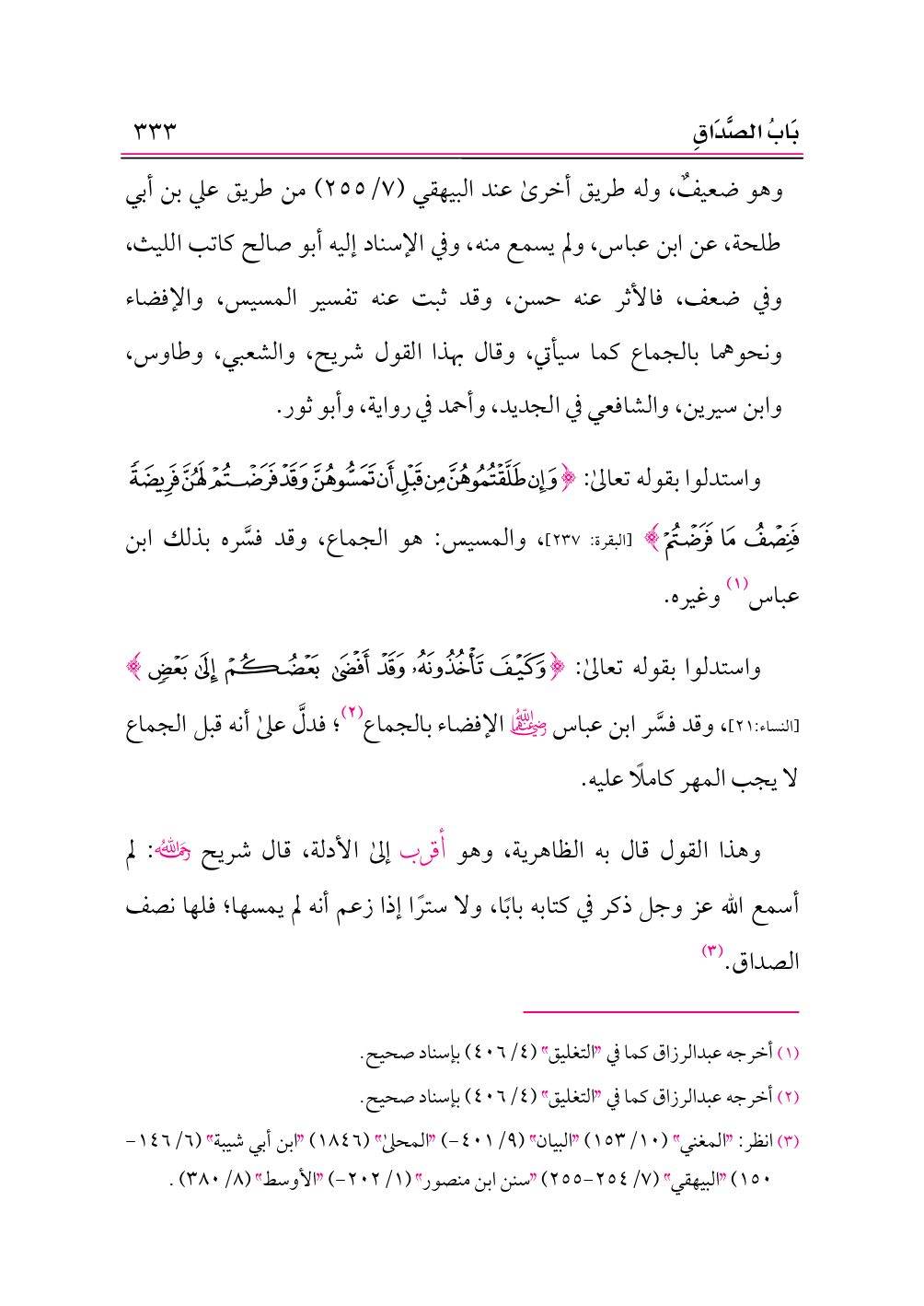 وهو ضعيفٌ، وله طريق أخرى عند البيهقي (٧/ ٢٥٥) من طريق علي بن أبي طلحة، عن ابن عباس، ولم يسمع منه، وفي الإسناد إليه أبو صالح كاتب الليث، وفي ضعف، فالأثر عنه حسن، وقد ثبت عنه تفسير المسيس، والإفضاء ونحوهما بالجماع كما سيأتي، وقال بهذا القول شريح، والشعبي، وطاوس، وابن سيرين، والشافعي في الجديد، وأحمد في رواية، وأبو ثور.
