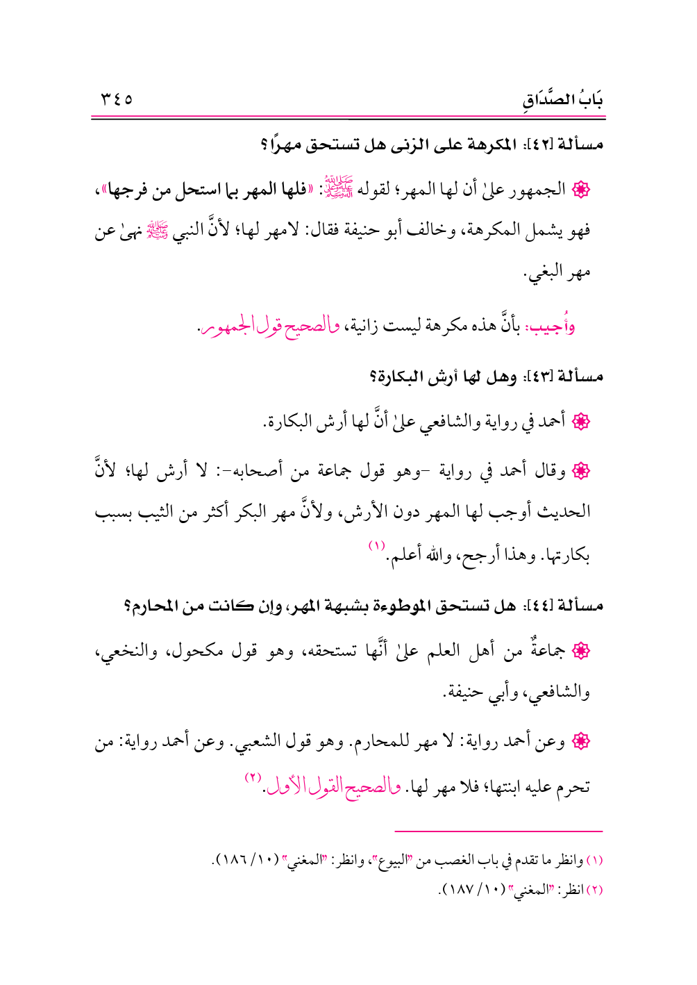 • وعن أحمد رواية: لا مهر للمحارم. وهو قول الشعبي. وعن أحمد رواية: من تحرم عليه ابنتها؛ فلا مهر لها. والصحيح القول الأول. (¬٢)