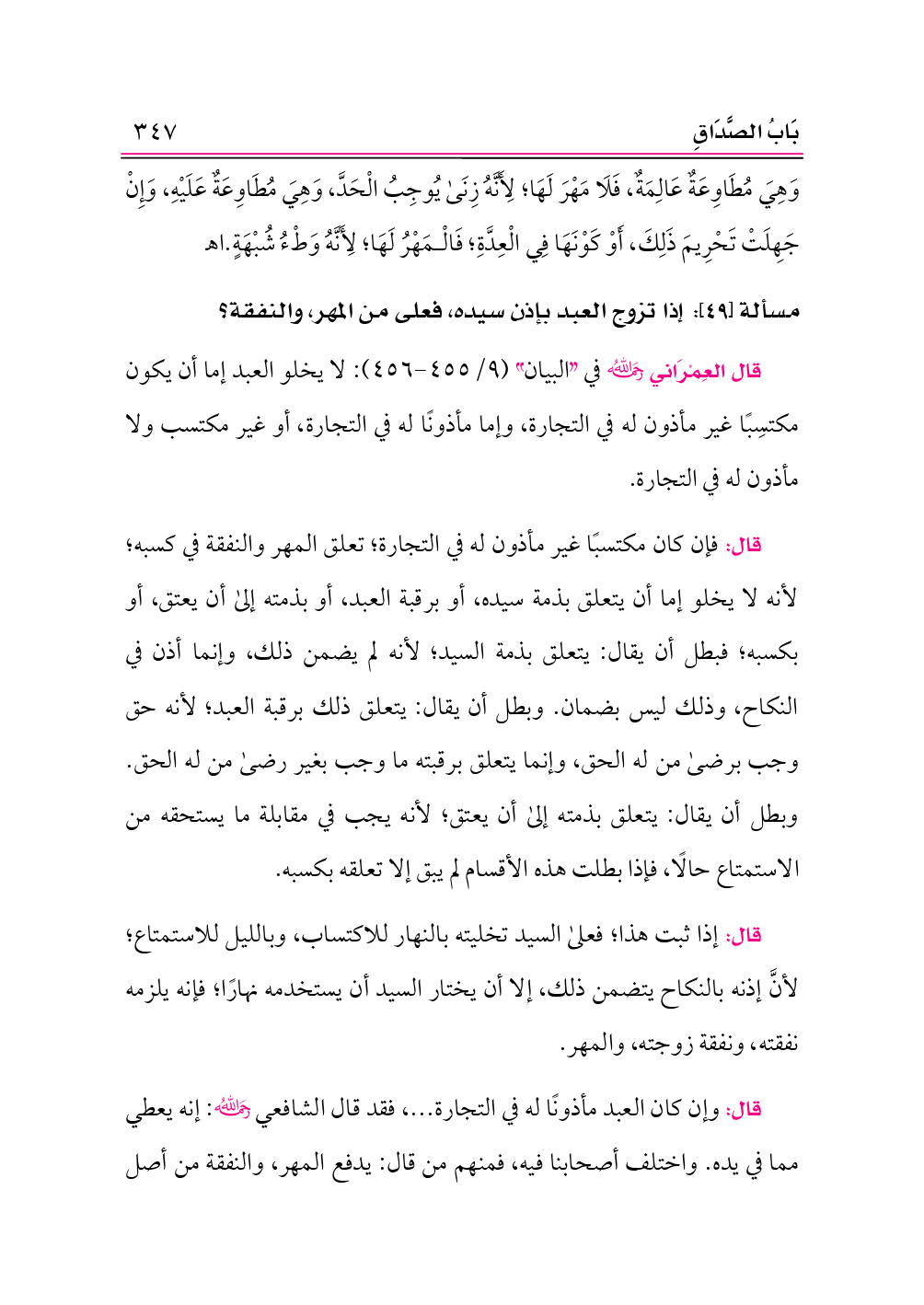 قال: فإن كان مكتسبًا غير مأذون له في التجارة؛ تعلق المهر والنفقة في كسبه؛ لأنه لا يخلو إما أن يتعلق بذمة سيده، أو برقبة العبد، أو بذمته إلى أن يعتق، أو بكسبه؛ فبطل أن يقال: يتعلق بذمة السيد؛ لأنه لم يضمن ذلك، وإنما أذن في النكاح، وذلك ليس بضمان. وبطل أن يقال: يتعلق ذلك برقبة العبد؛ لأنه حق وجب برضى من له الحق، وإنما يتعلق برقبته ما وجب بغير رضى من له الحق. وبطل أن يقال: يتعلق بذمته إلى أن يعتق؛ لأنه يجب في مقابلة ما يستحقه من الاستمتاع حالًا، فإذا بطلت هذه الأقسام لم يبق إلا تعلقه بكسبه.