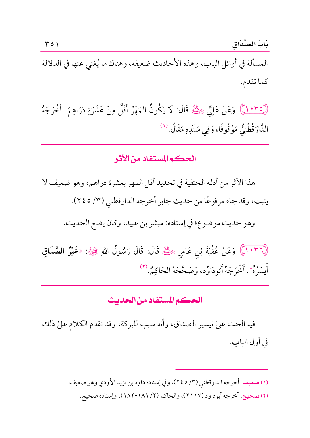 ١٠٣٦ - وَعَنْ عُقْبَةَ بْنِ عَامِرٍ -رضي الله عنه- قَالَ: قَالَ رَسُولُ اللهِ - صلى الله عليه وسلم -: «خَيْرُ الصَّدَاقِ أَيْسَرُهُ». أَخْرَجَهُ أَبُودَاوُد، وَصَحَّحَهُ الحَاكِمُ. (¬٢)