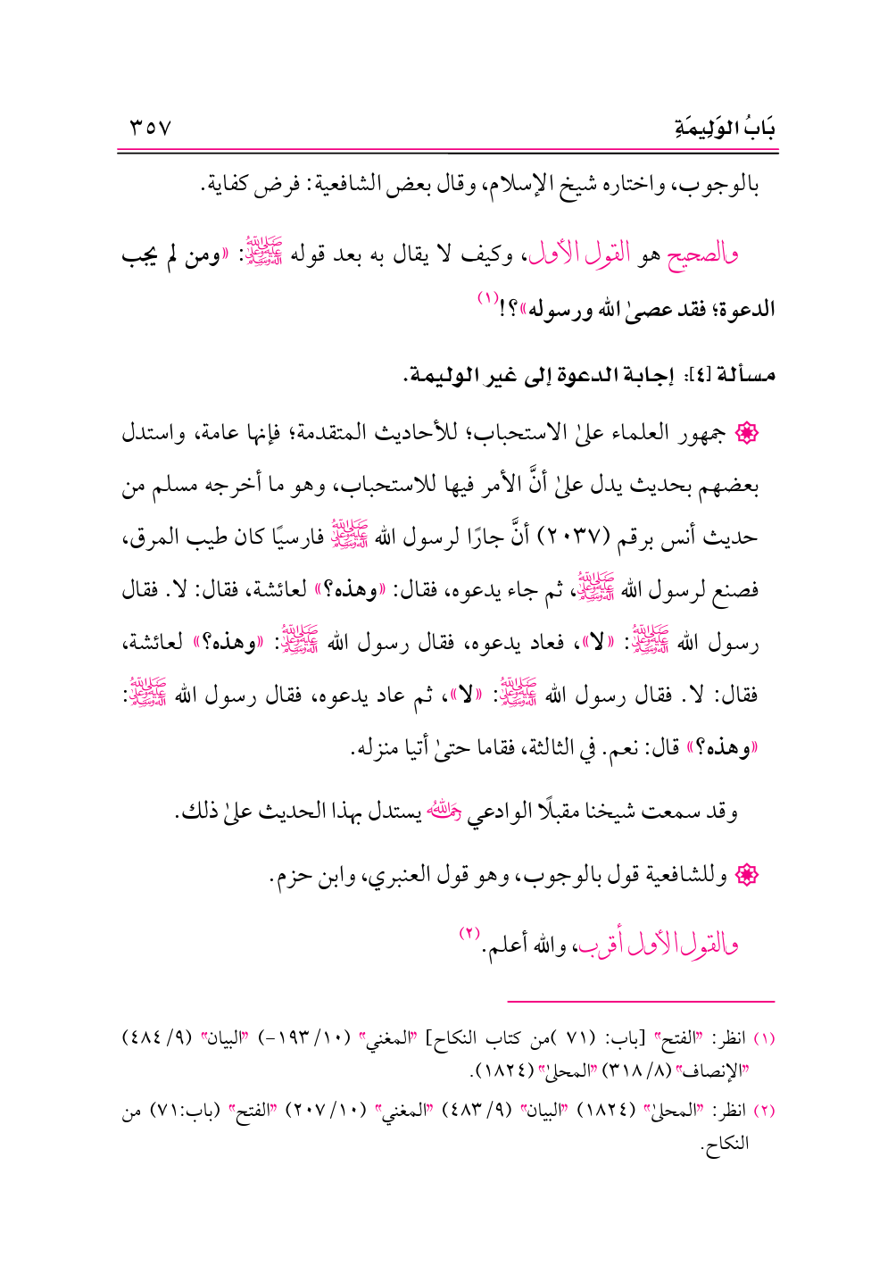 والصحيح هو القول الأول، وكيف لا يقال به بعد قوله -صلى الله عليه وعلى آله وسلم-: «ومن لم يجب الدعوة؛ فقد عصى الله ورسوله»؟! (¬١)