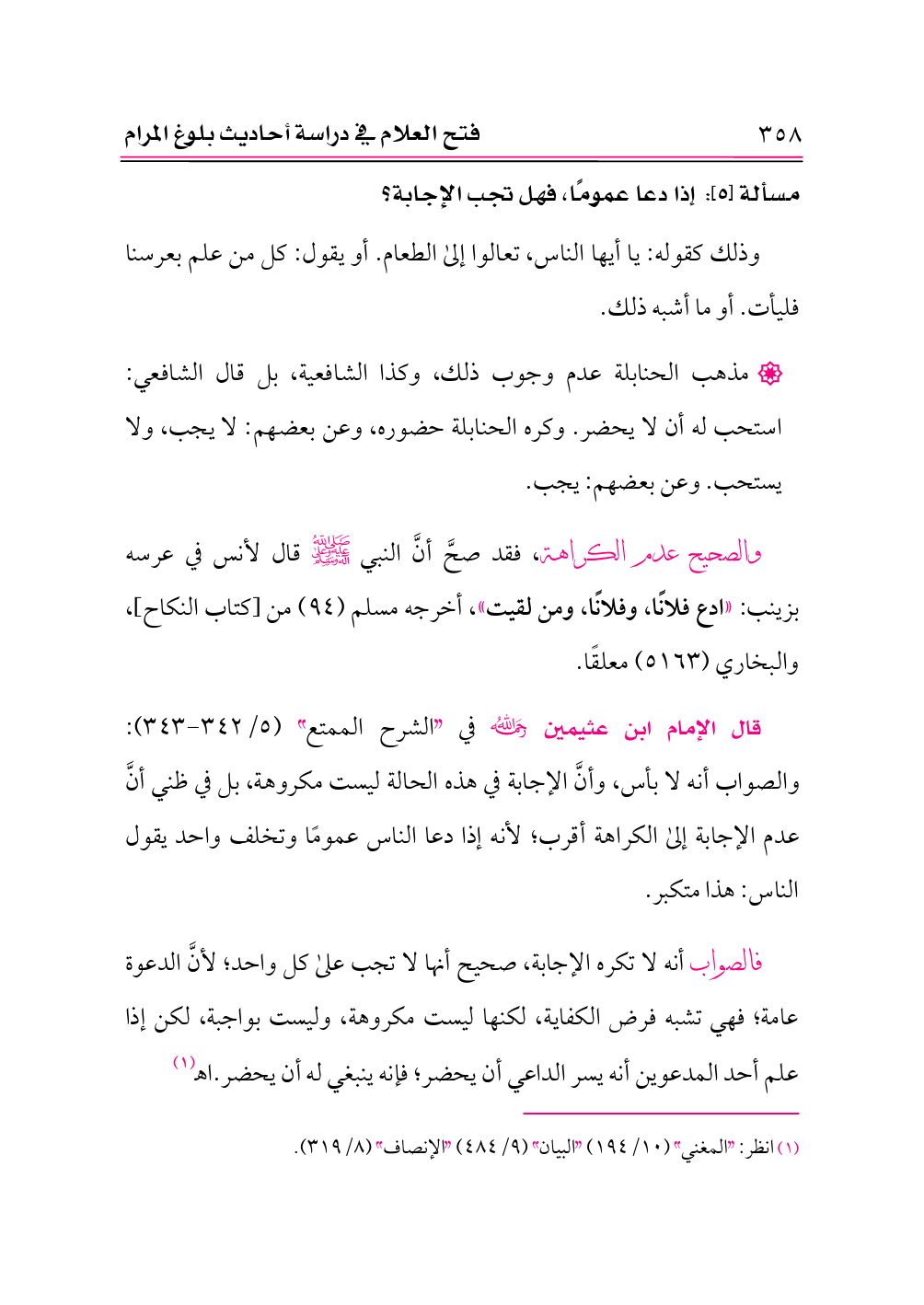 قال الإمام ابن عثيمين -رحمه الله- في «الشرح الممتع» (٥/ ٣٤٢ - ٣٤٣): والصواب أنه لا بأس، وأنَّ الإجابة في هذه الحالة ليست مكروهة، بل في ظني أنَّ عدم الإجابة إلى الكراهة أقرب؛ لأنه إذا دعا الناس عمومًا وتخلف واحد يقول الناس: هذا متكبر.