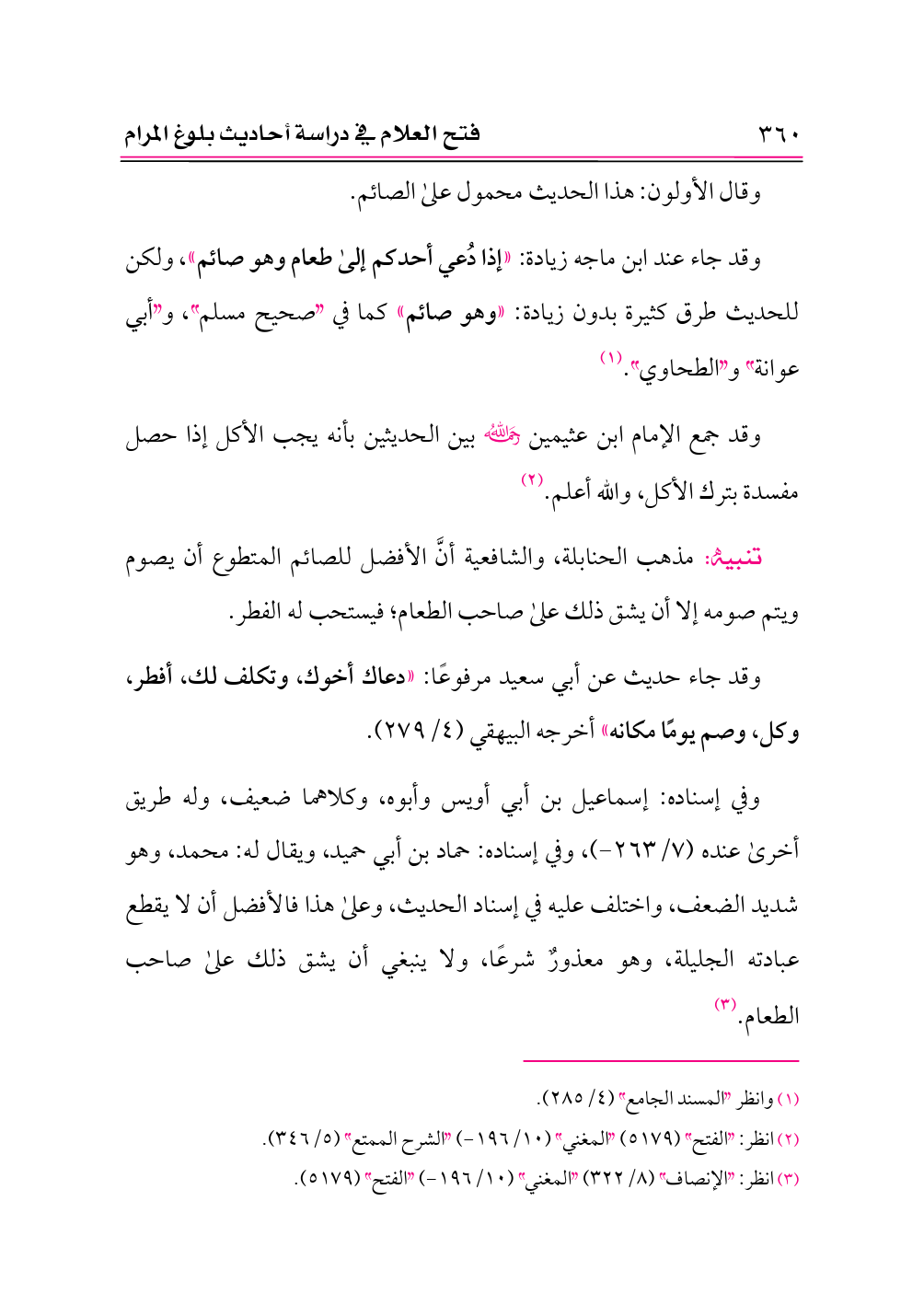 وفي إسناده: إسماعيل بن أبي أويس وأبوه، وكلاهما ضعيف، وله طريق أخرى عنده (٧/ ٢٦٣ - )، وفي إسناده: حماد بن أبي حميد، ويقال له: محمد، وهو شديد الضعف، واختلف عليه في إسناد الحديث، وعلى هذا فالأفضل أن لا يقطع عبادته الجليلة، وهو معذورٌ شرعًا، ولا ينبغي أن يشق ذلك على صاحب الطعام. (¬٣)