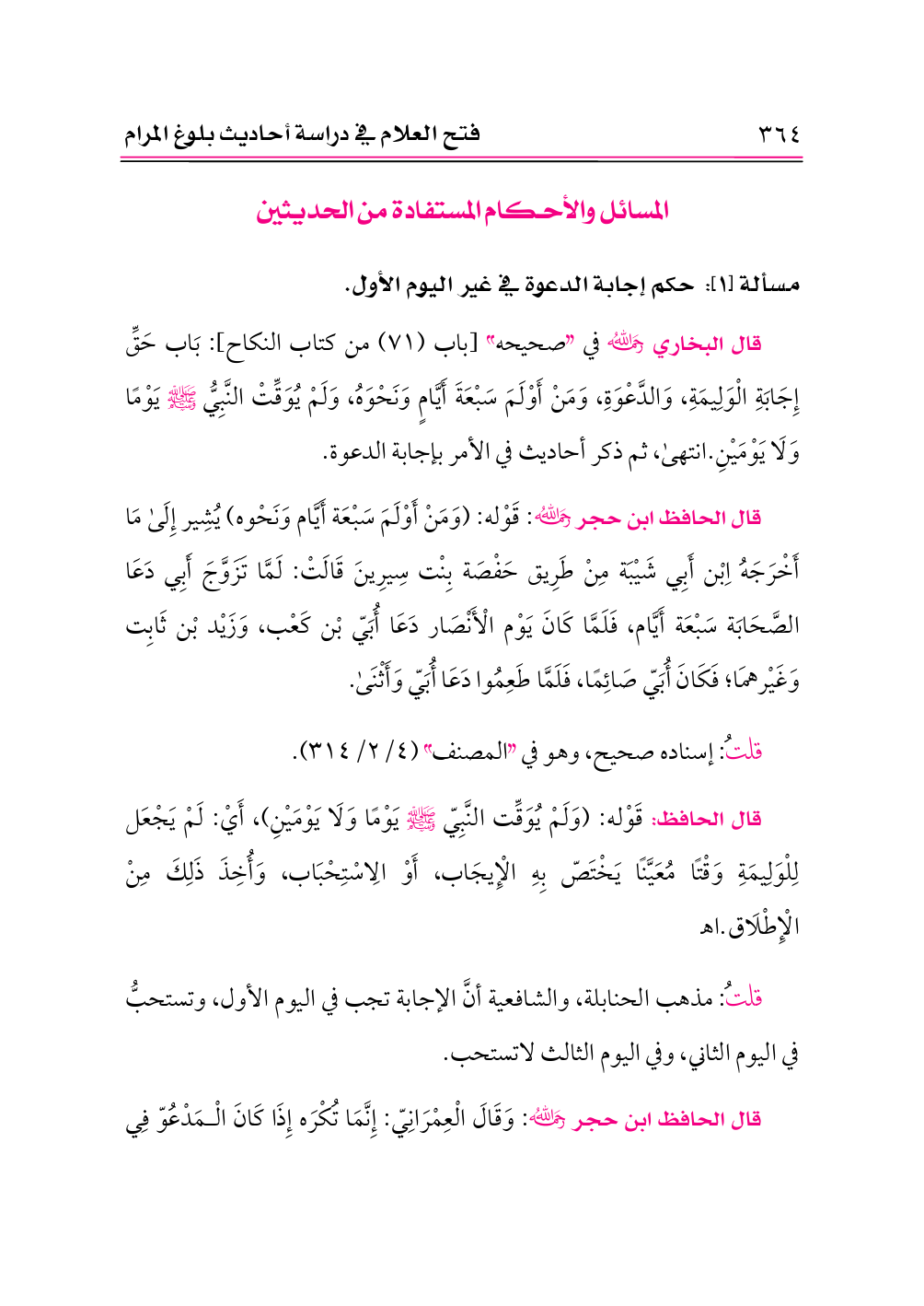 قلتُ: مذهب الحنابلة، والشافعية أنَّ الإجابة تجب في اليوم الأول، وتستحبُّ في اليوم الثاني، وفي اليوم الثالث لاتستحب.