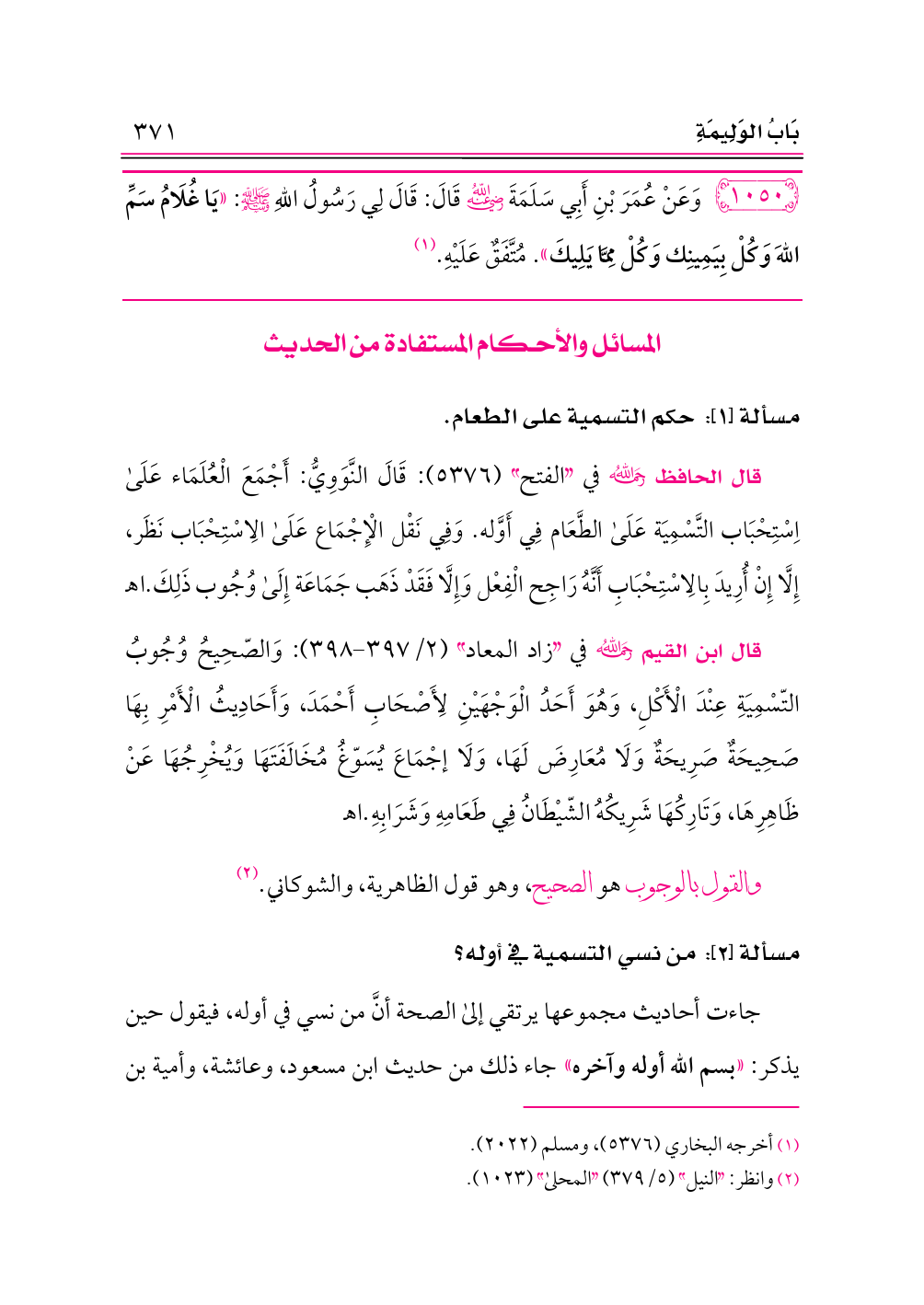 ١٠٥٠ - وَعَنْ عُمَرَ بْنِ أَبِي سَلَمَةَ -رضي الله عنه- قَالَ: قَالَ لِي رَسُولُ اللهِ - صلى الله عليه وسلم -: «يَا غُلَامُ سَمِّ اللهَ وَكُلْ بِيَمِينِك وَكُلْ مِمَّا يَلِيكَ». مُتَّفَقٌ عَلَيْهِ. (¬١)