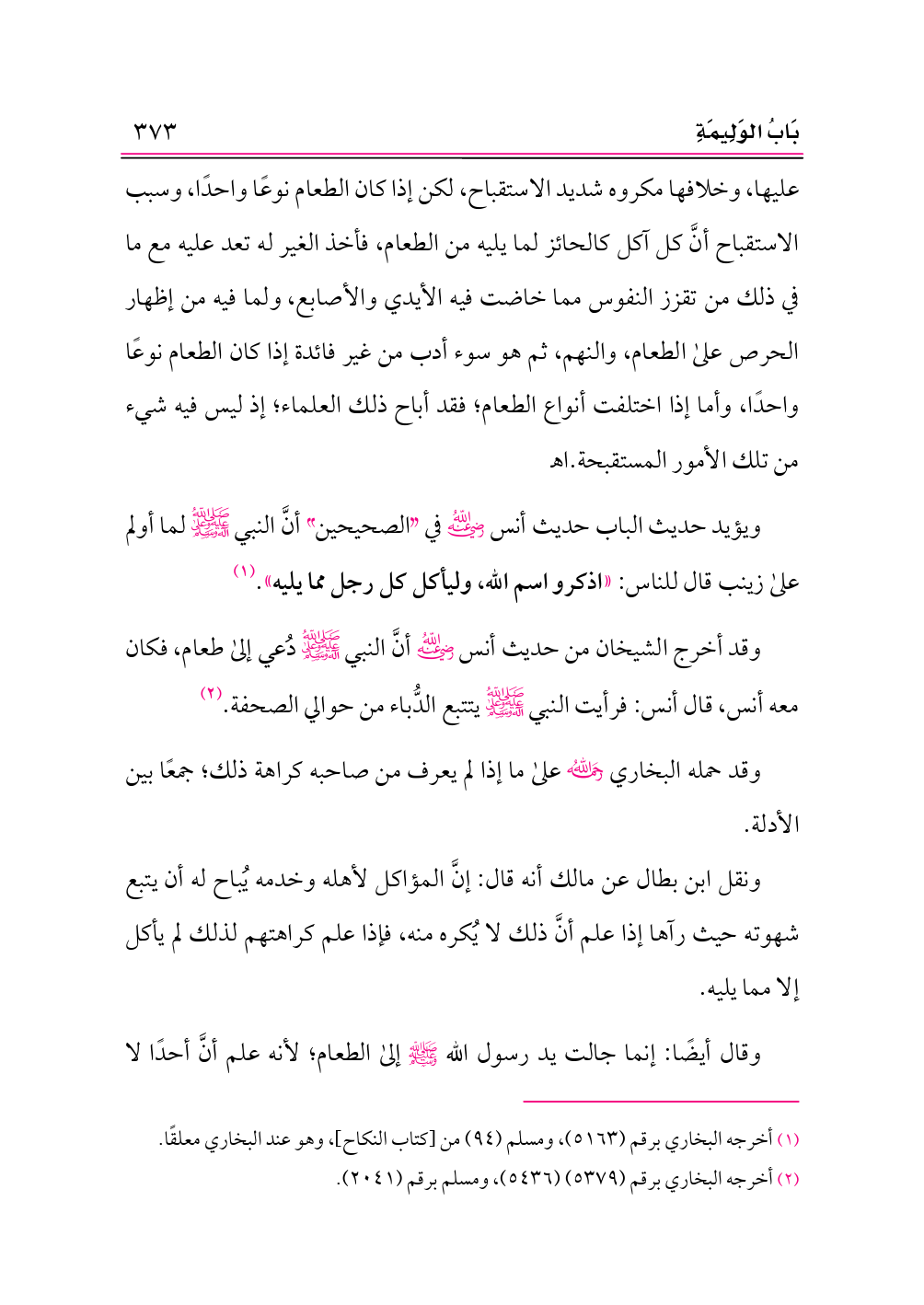 ويؤيد حديث الباب حديث أنس -رضي الله عنه- في «الصحيحين» أنَّ النبي -صلى الله عليه وعلى آله وسلم- لما أولم على زينب قال للناس: «اذكرو اسم الله، وليأكل كل رجل مما يليه». (¬١)