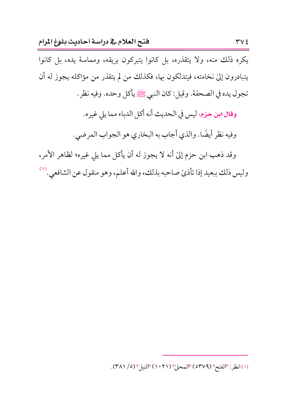وقد ذهب ابن حزم إلى أنه لا يجوز له أن يأكل مما يلي غيره؛ لظاهر الأمر، وليس ذلك ببعيد إذا تأذى صاحبه بذلك، والله أعلم، وهو منقول عن الشافعي. (¬١)