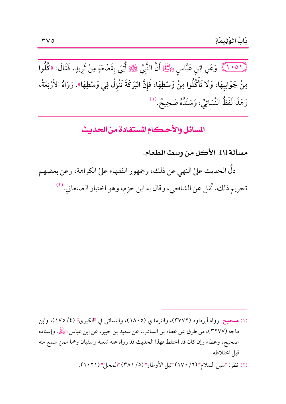١٠٥١ - وَعَنِ ابْنِ عَبَّاسٍ -رضي الله عنهما- أَنَّ النَّبِيَّ - صلى الله عليه وسلم - أُتِيَ بِقَصْعَةٍ مِنْ ثَرِيدٍ، فَقَالَ: «كُلُوا مِنْ جَوَانِبِهَا، وَلَا تَأْكُلُوا مِنْ وَسْطِهَا، فَإِنَّ البَرَكَةَ تَنْزِلُ فِي وَسْطِهَا». رَوَاهُ الأَرْبَعَةُ، وَهَذَا لَفْظُ النَّسَائِيِّ، وَسَنَدُهُ صَحِيحٌ. (¬١)