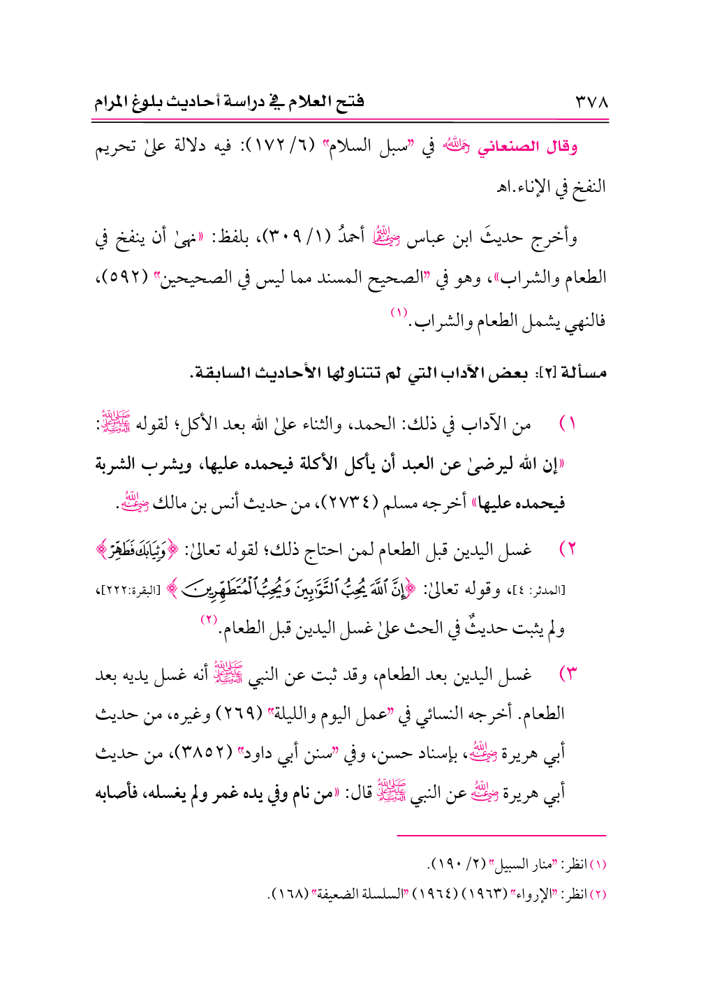 وأخرج حديثَ ابن عباس -رضي الله عنهما- أحمدُ (١/ ٣٠٩)، بلفظ: «نهى أن ينفخ في الطعام والشراب»، وهو في «الصحيح المسند مما ليس في الصحيحين» (٥٩٢)، فالنهي يشمل الطعام والشراب. (¬١)