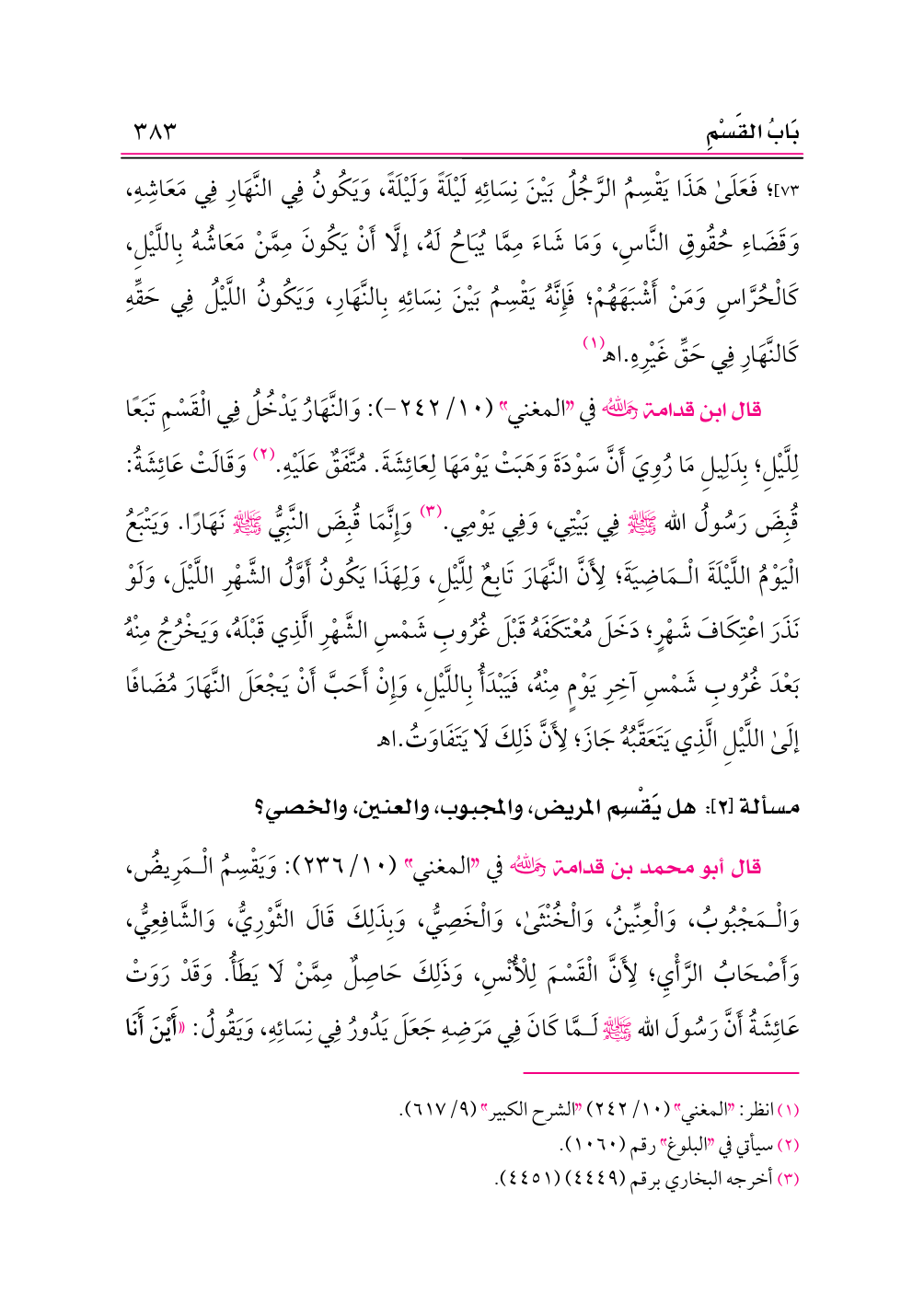 قال ابن قدامة -رحمه الله- في «المغني» (١٠/ ٢٤٢ - ): وَالنَّهَارُ يَدْخُلُ فِي الْقَسْمِ تَبَعًا لِلَّيْلِ؛ بِدَلِيلِ مَا رُوِيَ أَنَّ سَوْدَةَ وَهَبَتْ يَوْمَهَا لِعَائِشَةَ. مُتَّفَقٌ عَلَيْهِ. (¬٢) وَقَالَتْ عَائِشَةُ: قُبِضَ رَسُولُ الله - صلى الله عليه وسلم - فِي بَيْتِي، وَفِي يَوْمِي. (¬٣) وَإِنَّمَا قُبِضَ النَّبِيُّ - صلى الله عليه وسلم - نَهَارًا. وَيَتْبَعُ الْيَوْمُ اللَّيْلَةَ الْمَاضِيَةَ؛ لِأَنَّ النَّهَارَ تَابِعٌ لِلَّيْلِ، وَلِهَذَا يَكُونُ أَوَّلُ الشَّهْرِ اللَّيْلَ، وَلَوْ نَذَرَ اعْتِكَافَ شَهْرٍ؛ دَخَلَ مُعْتَكَفَهُ قَبْلَ غُرُوبِ شَمْسِ الشَّهْرِ الَّذِي قَبْلَهُ، وَيَخْرُجُ مِنْهُ بَعْدَ غُرُوبِ شَمْسِ آخِرِ يَوْمٍ مِنْهُ، فَيَبْدَأُ بِاللَّيْلِ، وَإِنْ أَحَبَّ أَنْ يَجْعَلَ النَّهَارَ مُضَافًا إلَى اللَّيْلِ الَّذِي يَتَعَقَّبُهُ جَازَ؛ لِأَنَّ ذَلِكَ لَا يَتَفَاوَتُ. اهـ