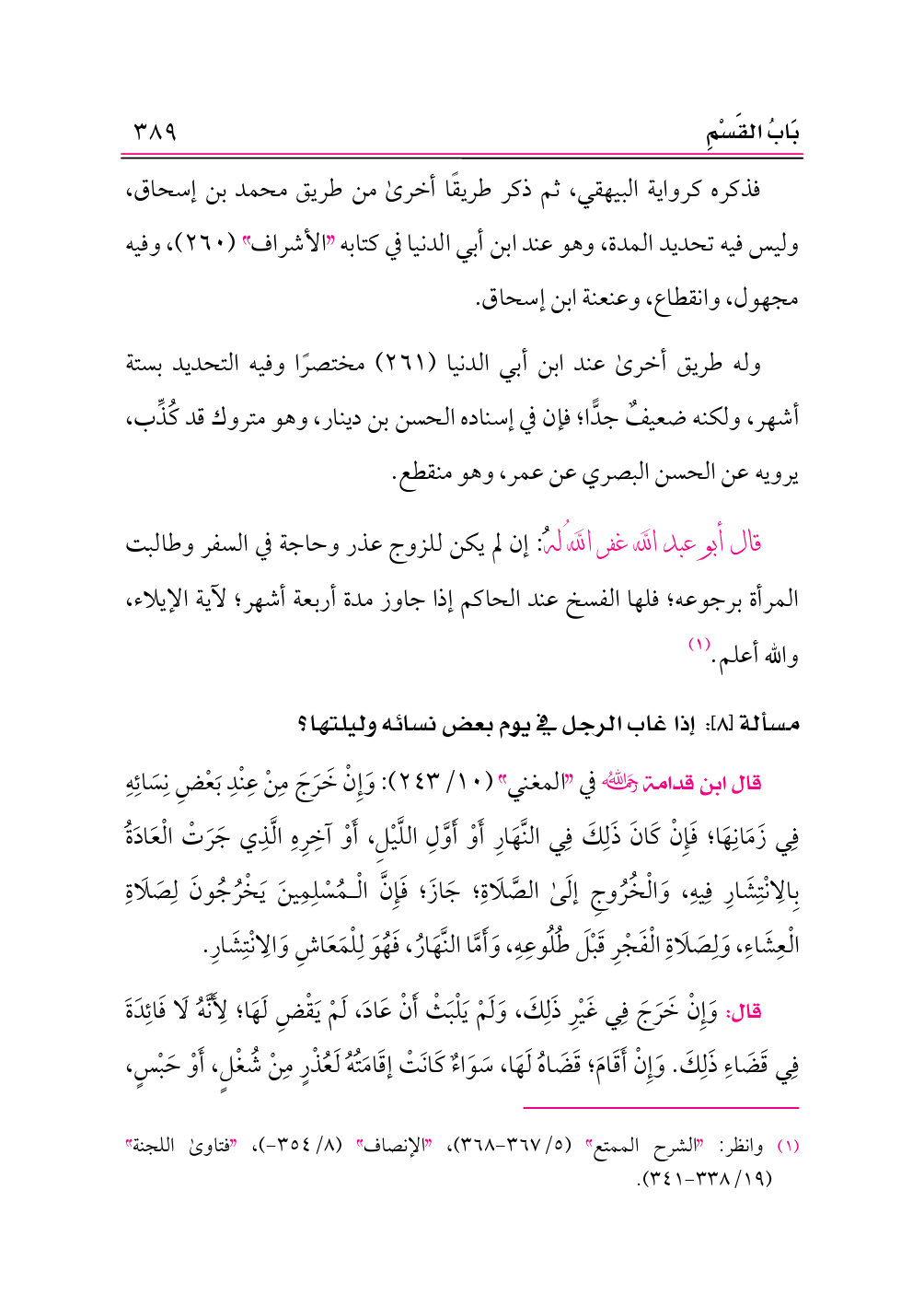 قال أبو عبد الله غفر اللهُ لهُ: إن لم يكن للزوج عذر وحاجة في السفر وطالبت المرأة برجوعه؛ فلها الفسخ عند الحاكم إذا جاوز مدة أربعة أشهر؛ لآية الإيلاء، والله أعلم. (¬١)