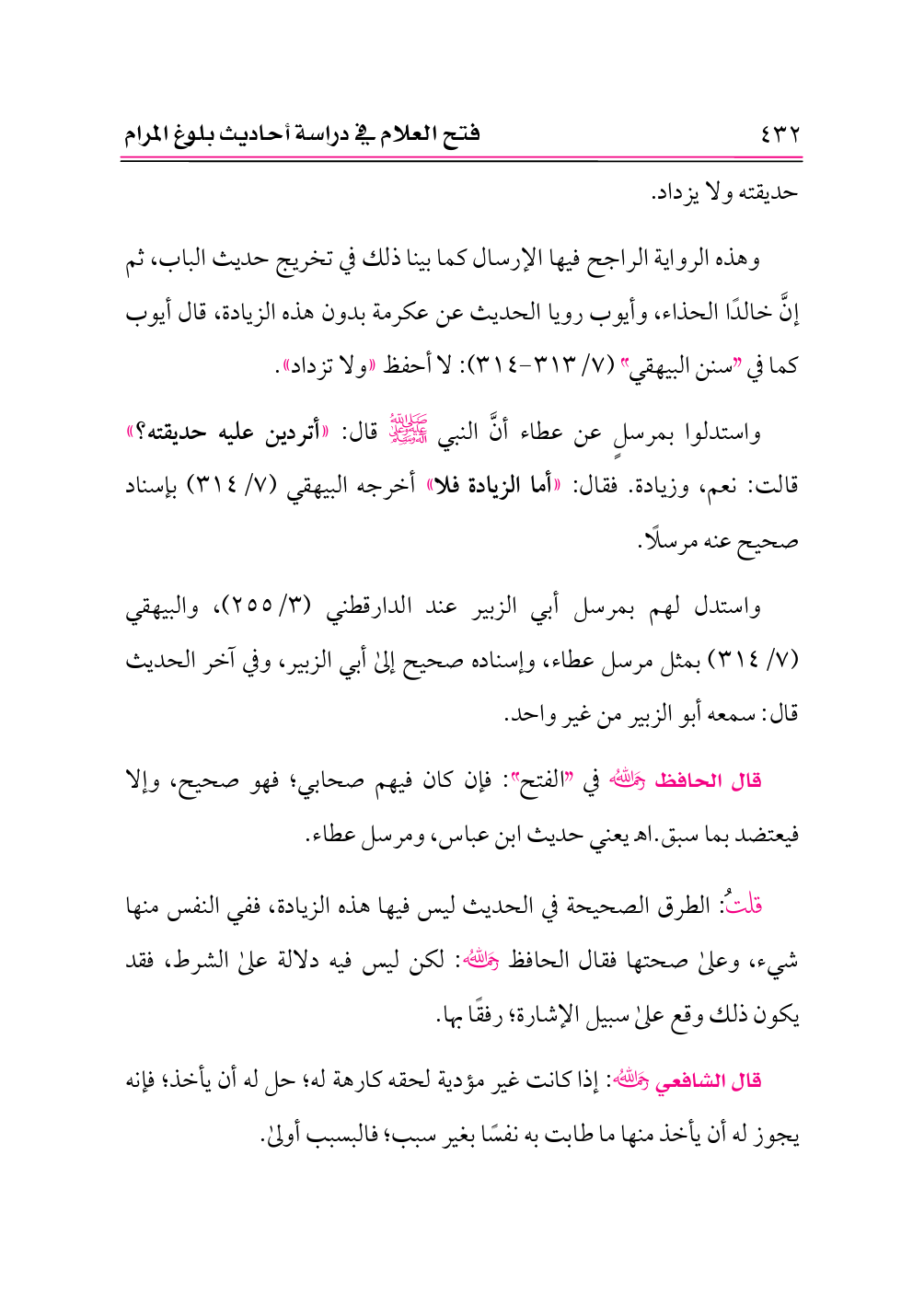واستدلوا بمرسلٍ عن عطاء أنَّ النبي -صلى الله عليه وعلى آله وسلم- قال: «أتردين عليه حديقته؟» قالت: نعم، وزيادة. فقال: «أما الزيادة فلا» أخرجه البيهقي (٧/ ٣١٤) بإسناد صحيح عنه مرسلًا.