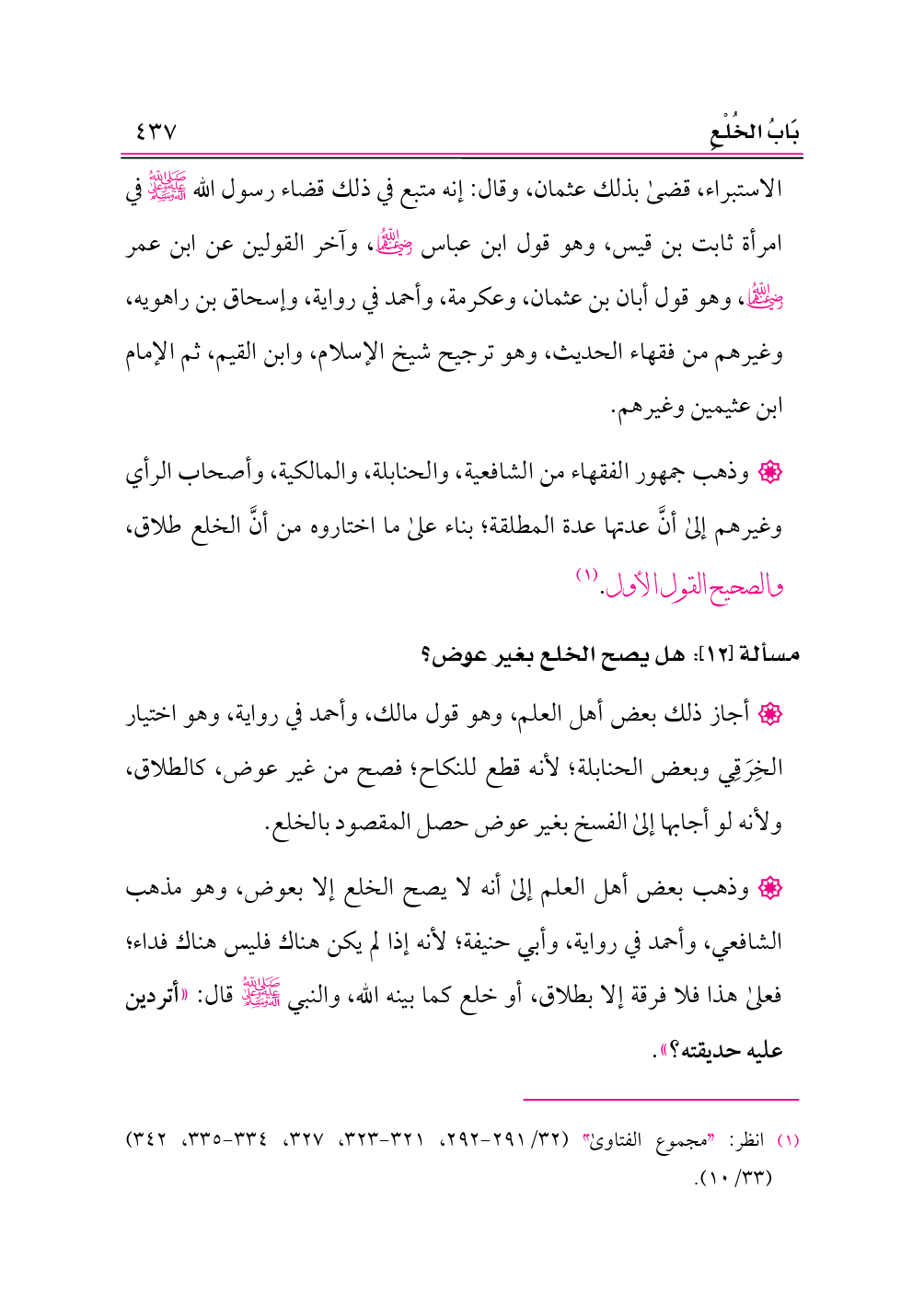 • وذهب بعض أهل العلم إلى أنه لا يصح الخلع إلا بعوض، وهو مذهب الشافعي، وأحمد في رواية، وأبي حنيفة؛ لأنه إذا لم يكن هناك فليس هناك فداء؛ فعلى هذا فلا فرقة إلا بطلاق، أو خلع كما بينه الله، والنبي -صلى الله عليه وعلى آله وسلم- قال: «أتردين عليه حديقته؟».