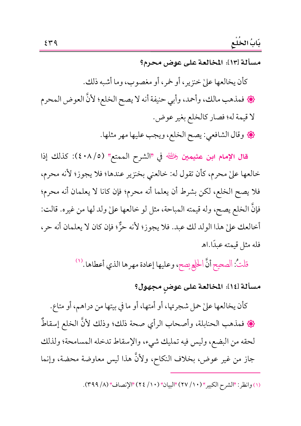 مسألة [١٣]: المخالعة على عوض محرم؟