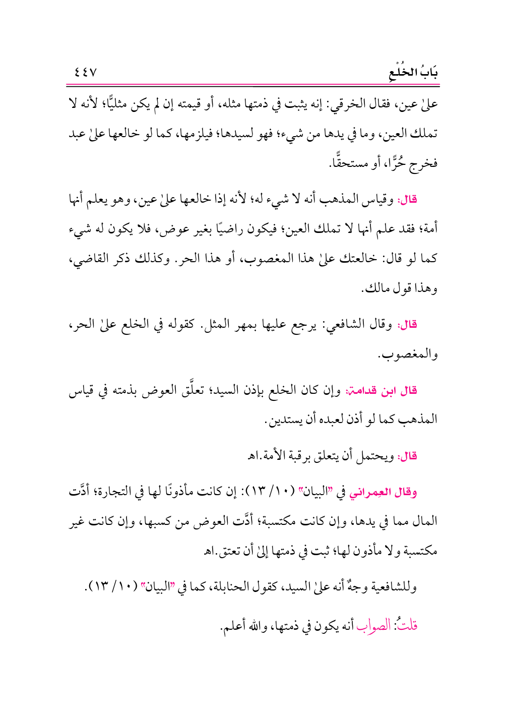 وقال العِمراني في «البيان» (١٠/ ١٣): إن كانت مأذونًا لها في التجارة؛ أدَّت المال مما في يدها، وإن كانت مكتسبة؛ أدَّت العوض من كسبها، وإن كانت غير مكتسبة ولا مأذون لها؛ ثبت في ذمتها إلى أن تعتق. اهـ