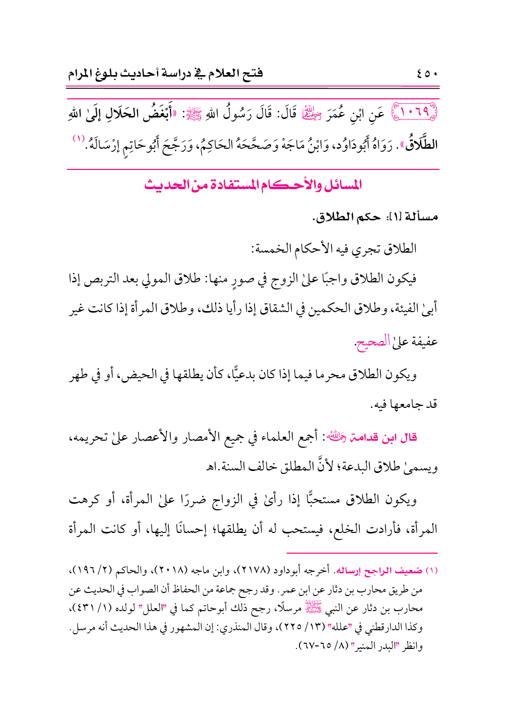 ١٠٦٩ - عَنِ ابْنِ عُمَرَ -رضي الله عنهما- قَالَ: قَالَ رَسُولُ اللهِ - صلى الله عليه وسلم -: «أَبْغَضُ الحَلَالِ إلَى اللهِ الطَّلَاقُ». رَوَاهُ أَبُودَاوُد، وَابْنُ مَاجَهْ وَصَحَّحَهُ الحَاكِمُ، وَرَجَّحَ أَبُوحَاتِمٍ إرْسَالَهُ. (¬١)