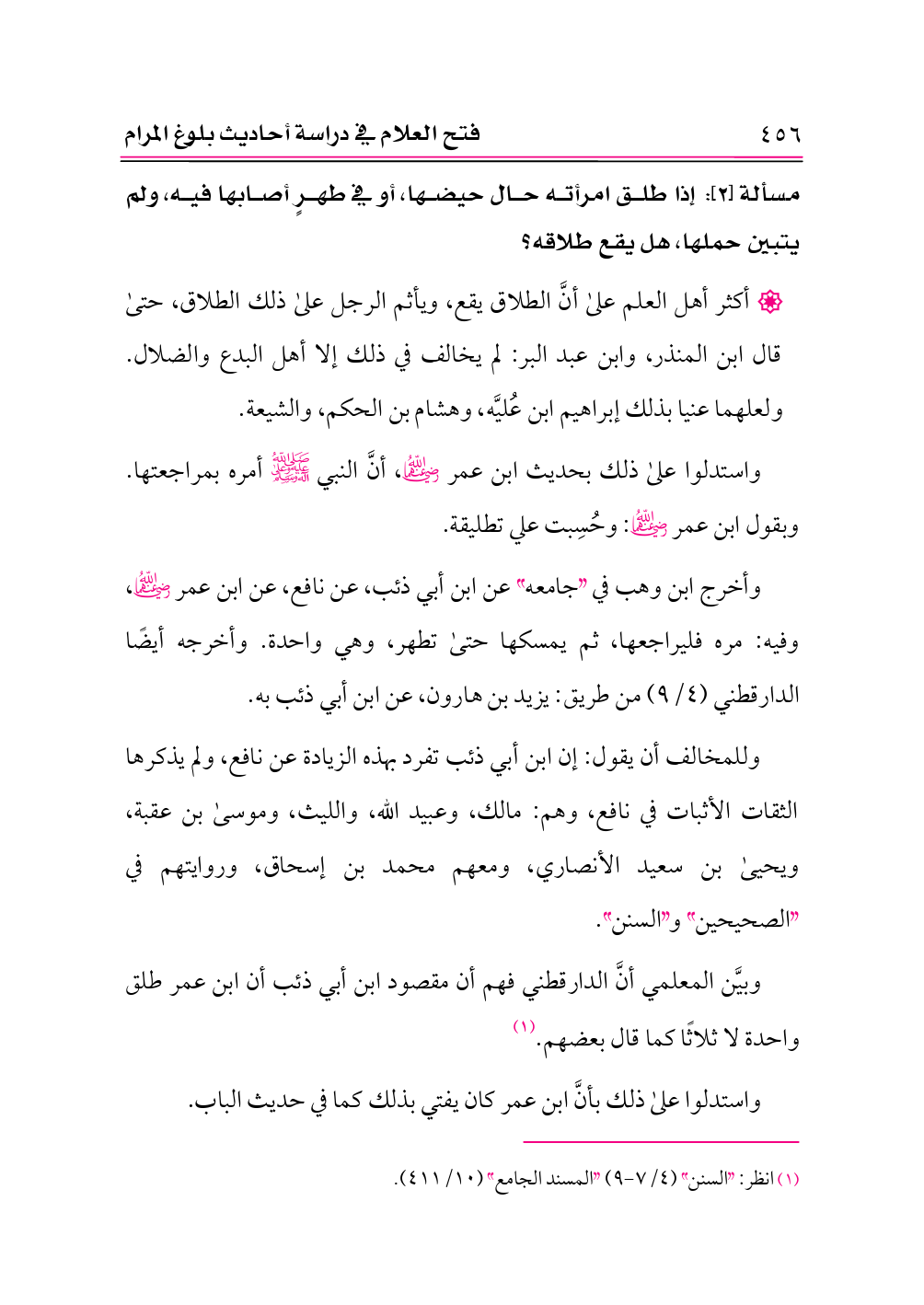 وبيَّن المعلمي أنَّ الدارقطني فهم أن مقصود ابن أبي ذئب أن ابن عمر طلق واحدة لا ثلاثًا كما قال بعضهم. (¬١)