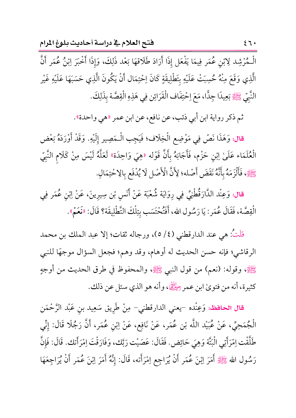 قال: وَعِنْد الدَّارَقُطْنِيِّ فِي رِوَايَة شُعْبَة عَنْ أَنَسِ بْن سِيرِينَ، عَنْ اِبْنِ عُمَر فِي الْقِصَّة، فَقَالَ عُمَر: يَا رَسُول الله، أَفَتُحْتَسَب بِتِلْكَ التَّطْلِيقَة؟ قَالَ: «نَعَمْ».