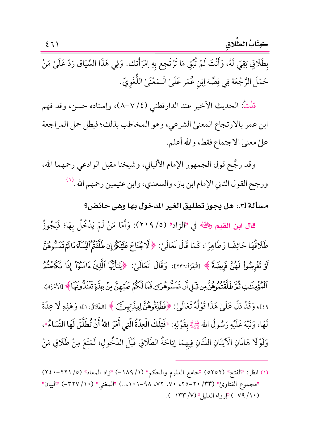 قلتُ: الحديث الأخير عند الدارقطني (٤/ ٧ - ٨)، وإسناده حسن، وقد فهم ابن عمر بالارتجاع المعنى الشرعي، وهو المخاطب بذلك؛ فبطل حمل المراجعة على معنى الاجتماع فقط، والله أعلم.