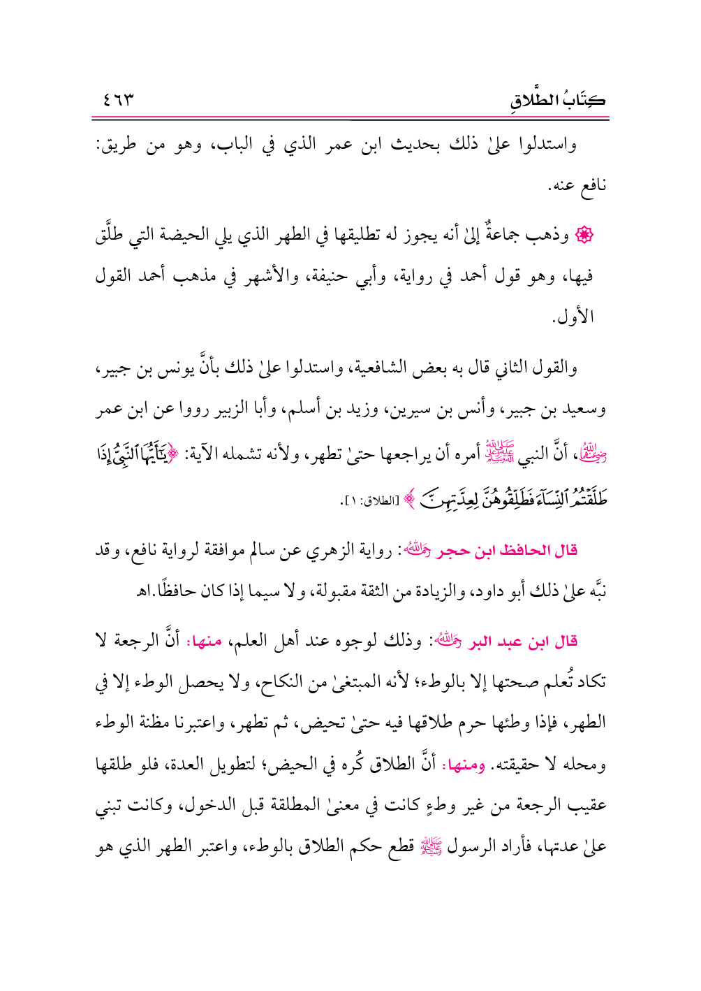 • وذهب جماعةٌ إلى أنه يجوز له تطليقها في الطهر الذي يلي الحيضة التي طلَّق فيها، وهو قول أحمد في رواية، وأبي حنيفة، والأشهر في مذهب أحمد القول الأول.