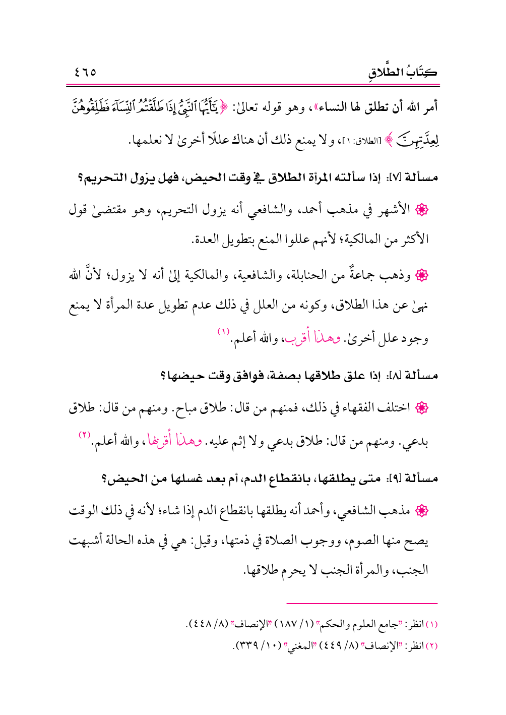 مسألة [٧]: إذا سألته المرأة الطلاق في وقت الحيض، فهل يزول التحريم؟