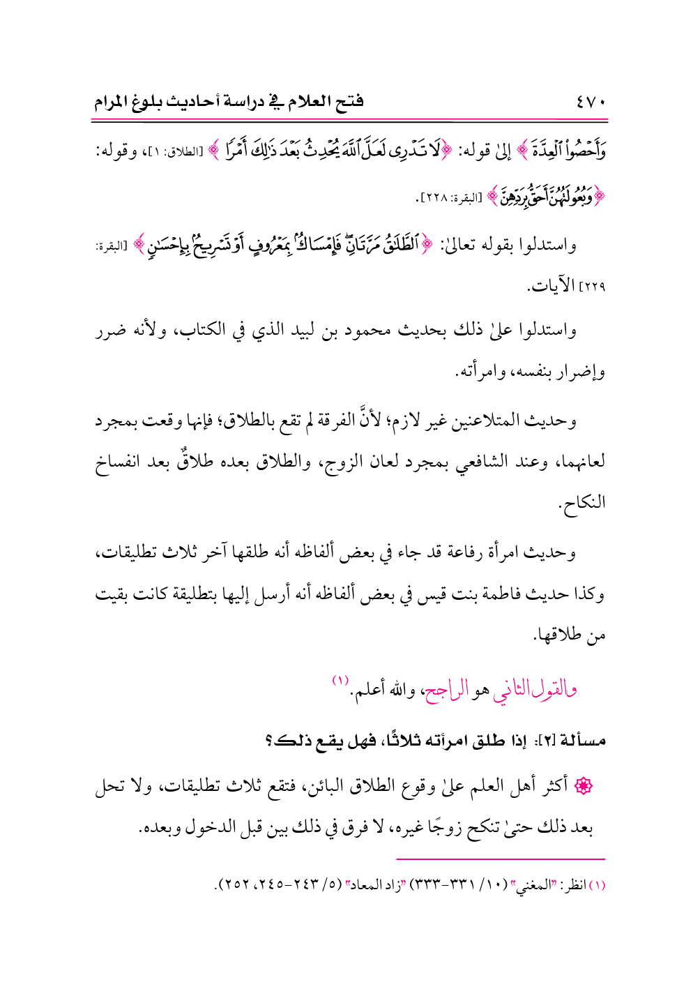 وحديث المتلاعنين غير لازم؛ لأنَّ الفرقة لم تقع بالطلاق؛ فإنها وقعت بمجرد لعانهما، وعند الشافعي بمجرد لعان الزوج، والطلاق بعده طلاقٌ بعد انفساخ النكاح.