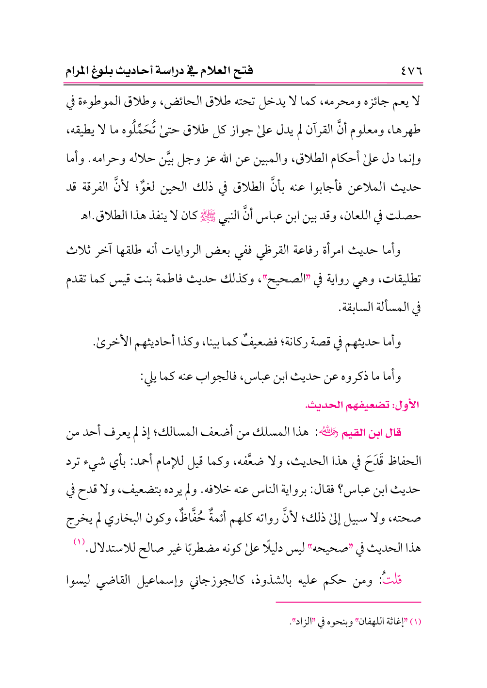 لا يعم جائزه ومحرمه، كما لا يدخل تحته طلاق الحائض، وطلاق الموطوءة في طهرها، ومعلوم أنَّ القرآن لم يدل على جواز كل طلاق حتى تُحَمِّلُوه ما لا يطيقه، وإنما دل على أحكام الطلاق، والمبين عن الله عز وجل بيَّن حلاله وحرامه. وأما حديث الملاعن فأجابوا عنه بأنَّ الطلاق في ذلك الحين لغوٌ؛ لأنَّ الفرقة قد حصلت في اللعان، وقد بين ابن عباس أنَّ النبي - صلى الله عليه وسلم - كان لا ينفذ هذا الطلاق. اهـ