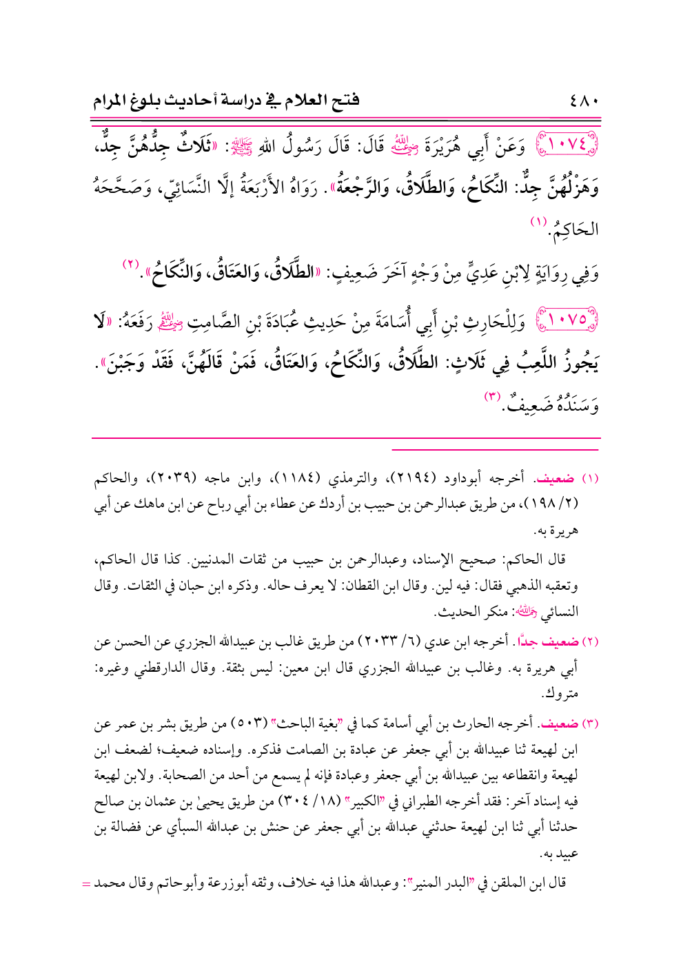 ١٠٧٤ - وَعَنْ أَبِي هُرَيْرَةَ -رضي الله عنه- قَالَ: قَالَ رَسُولُ اللهِ - صلى الله عليه وسلم -: «ثَلَاثٌ جِدُّهُنَّ جِدٌّ، وَهَزْلُهُنَّ جِدٌّ: النِّكَاحُ، وَالطَّلَاقُ، وَالرَّجْعَةُ». رَوَاهُ الأَرْبَعَةُ إلَّا النَّسَائِيّ، وَصَحَّحَهُ الحَاكِمُ. (¬١)