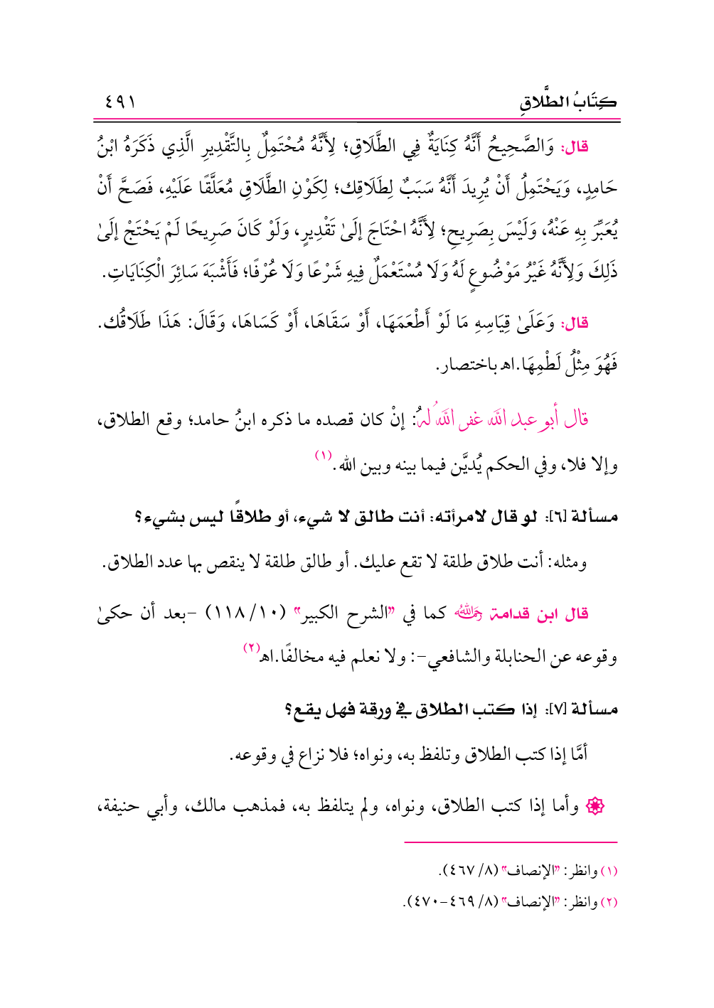 قال أبو عبد الله غفر اللهُ لهُ: إنْ كان قصده ما ذكره ابنُ حامد؛ وقع الطلاق، وإلا فلا، وفي الحكم يُديَّن فيما بينه وبين الله. (¬١)
