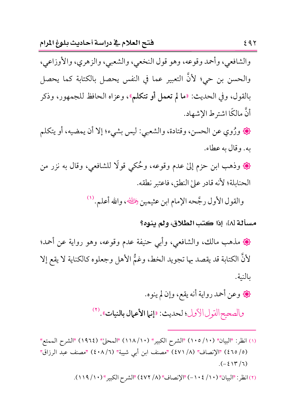 والشافعي، وأحمد وقوعه، وهو قول النخعي، والشعبي، والزهري، والأوزاعي، والحسن بن حي؛ لأنَّ التعبير عما في النفس يحصل بالكتابة كما يحصل بالقول، وفي الحديث: «ما لم تعمل أو تتكلم»، وعزاه الحافظ للجمهور، وذكر أنَّ مالكًا اشترط الإشهاد.