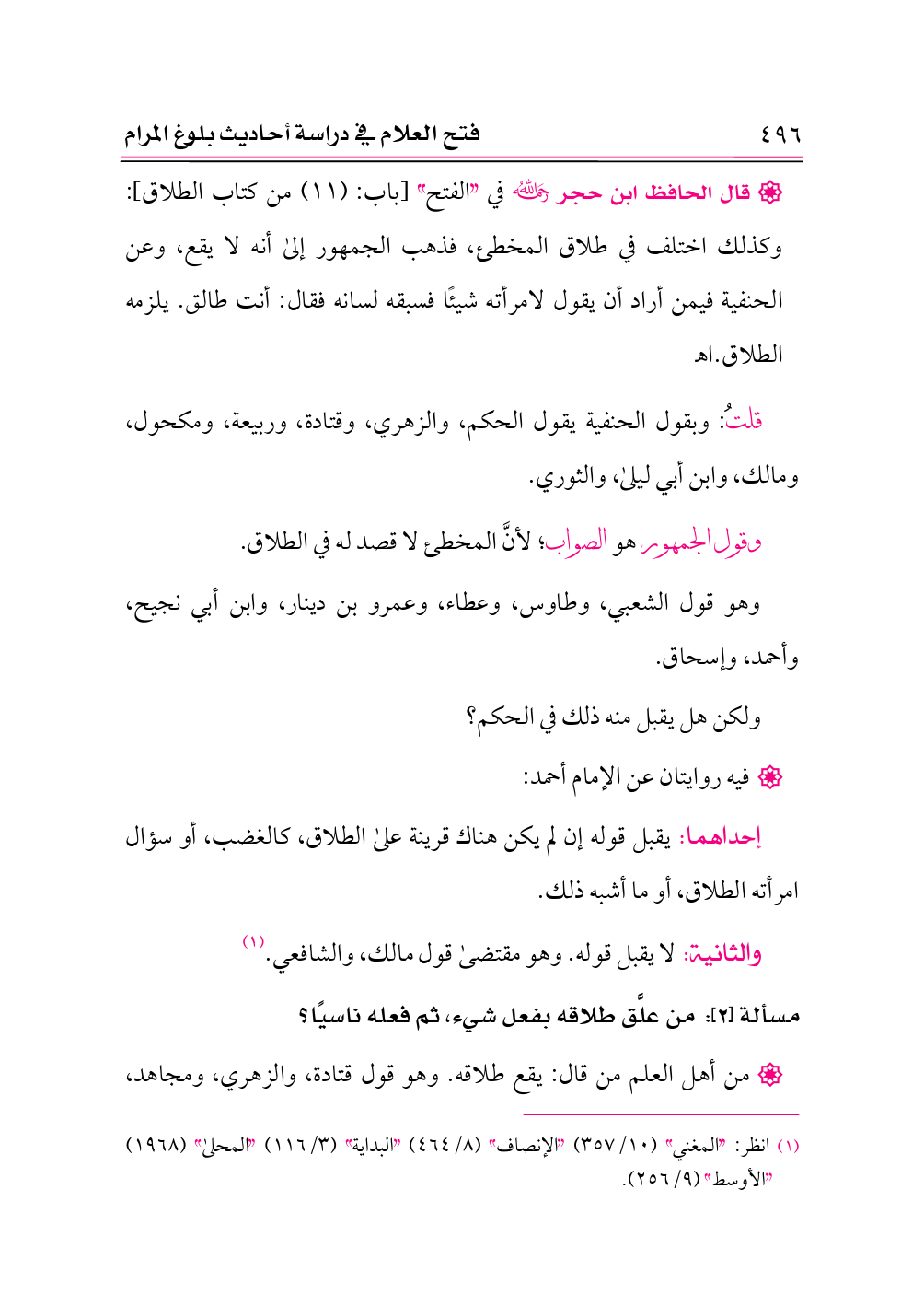 • قال الحافظ ابن حجر -رحمه الله- في «الفتح» [باب: (١١) من كتاب الطلاق]: وكذلك اختلف في طلاق المخطئ، فذهب الجمهور إلى أنه لا يقع، وعن الحنفية فيمن أراد أن يقول لامرأته شيئًا فسبقه لسانه فقال: أنت طالق. يلزمه الطلاق. اهـ