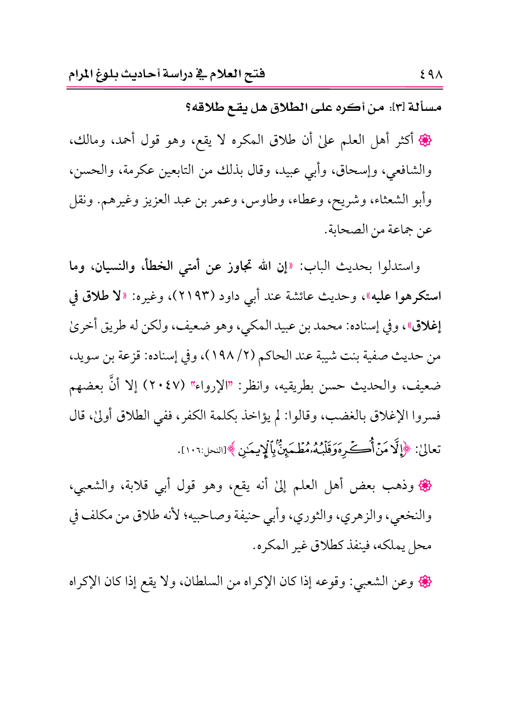 واستدلوا بحديث الباب: «إن الله تجاوز عن أمتي الخطأ، والنسيان، وما استكرهوا عليه»، وحديث عائشة عند أبي داود (٢١٩٣)، وغيره: «لا طلاق في إغلاق»، وفي إسناده: محمد بن عبيد المكي، وهو ضعيف، ولكن له طريق أخرى من حديث صفية بنت شيبة عند الحاكم (٢/ ١٩٨)، وفي إسناده: قزعة بن سويد، ضعيف، والحديث حسن بطريقيه، وانظر: «الإرواء» (٢٠٤٧) إلا أنَّ بعضهم فسروا الإغلاق بالغضب، وقالوا: لم يؤاخذ بكلمة الكفر، ففي الطلاق أولى، قال تعالى: {إِلَّا مَنْ أُكْرِهَ وَقَلْبُهُ مُطْمَئِنٌّ بِالْإِيمَانِ} [النحل:١٠٦].