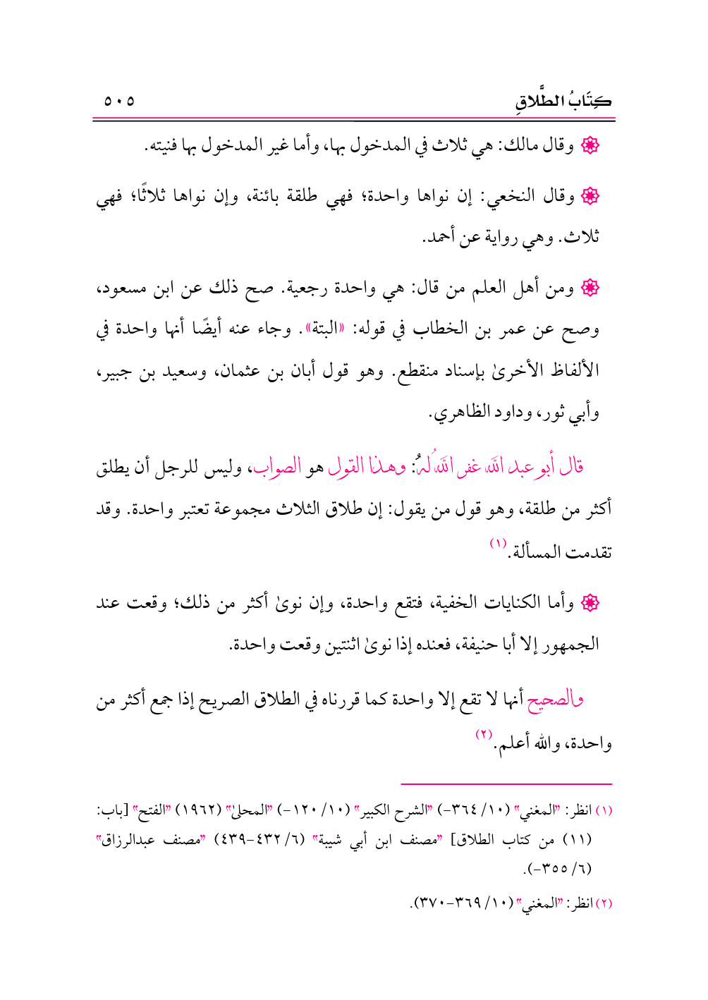 (¬١) انظر: «المغني» (١٠/ ٣٦٤ - ) «الشرح الكبير» (١٠/ ١٢٠ - ) «المحلى» (١٩٦٢) «الفتح» [باب: (١١) من كتاب الطلاق] «مصنف ابن أبي شيبة» (٦/ ٤٣٢ - ٤٣٩) «مصنف عبدالرزاق» (٦/ ٣٥٥ - ).
