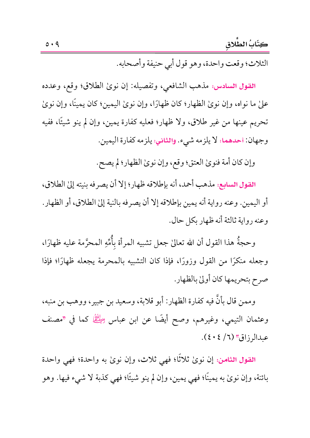 القول السابع: مذهب أحمد، أنه بإطلاقه ظهار؛ إلا أن يصرفه بنيته إلى الطلاق، أو اليمين. وعنه رواية أنه يمين بإطلاقه إلا أن يصرفه بالنية إلى الطلاق، أو الظهار. وعنه رواية ثالثة أنه ظهار بكل حال.
